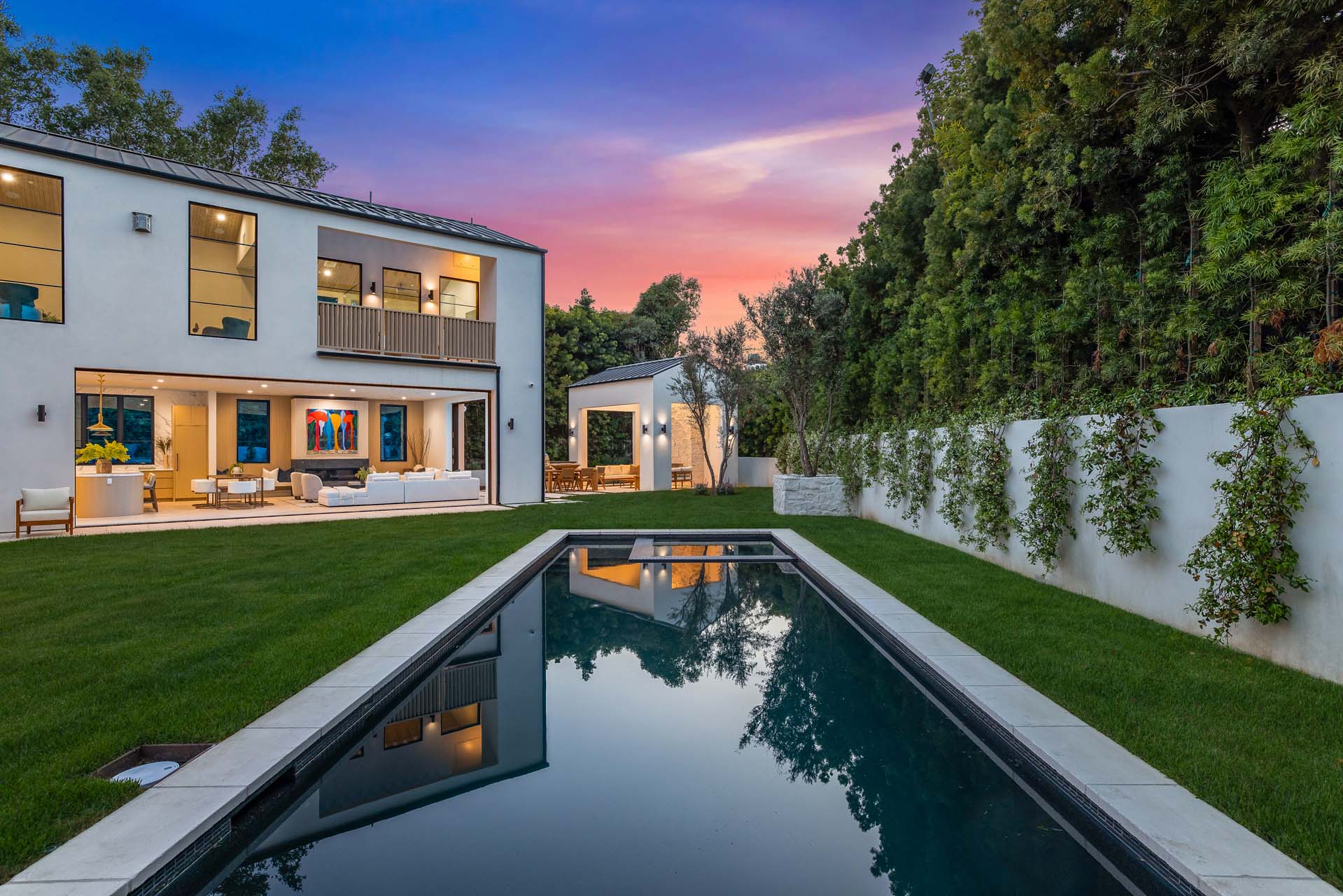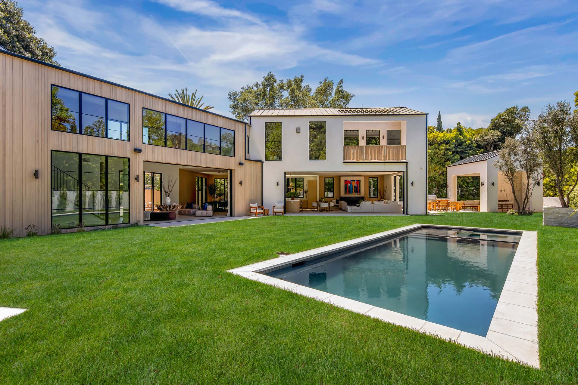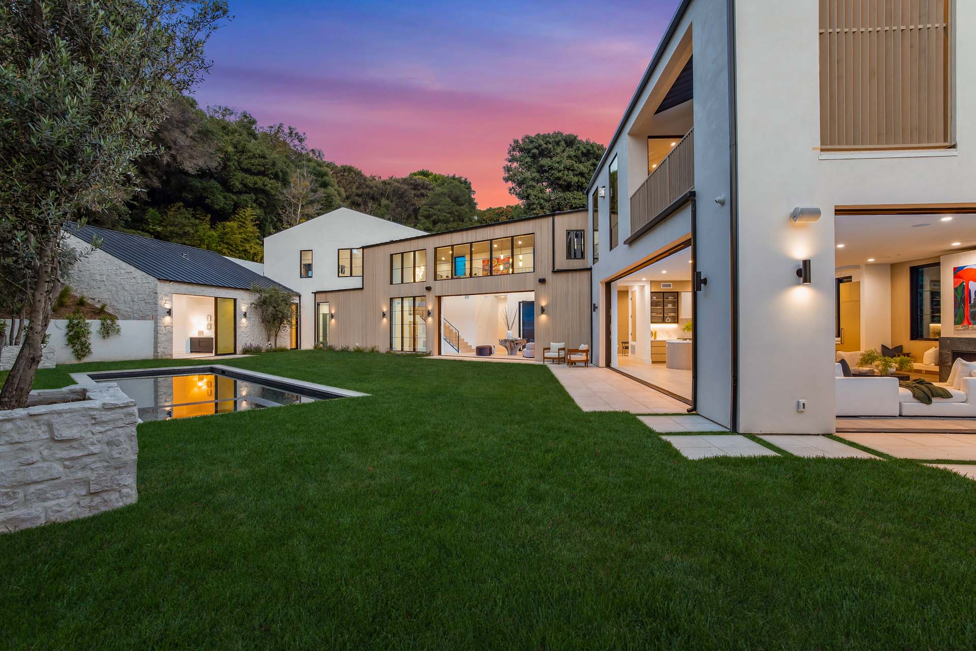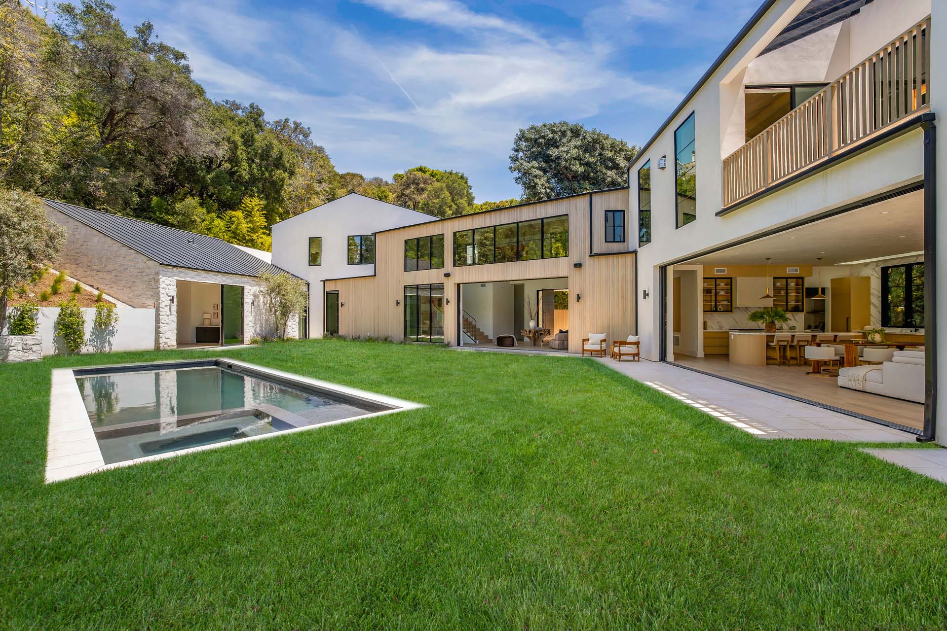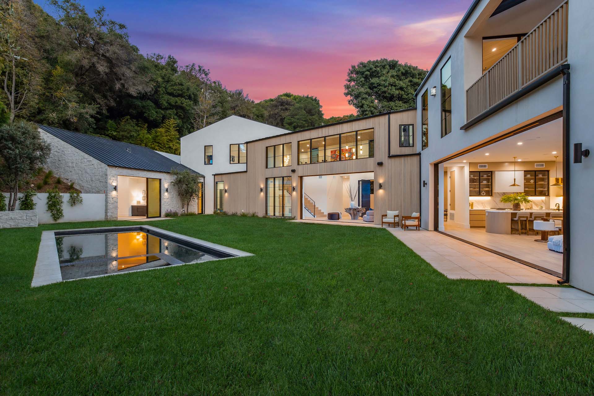 Nestled at the end of a quiet cul-de-sac on a tranquil lane just off the first block of lower Mandeville Canyon, this brand-new construction Modernist Farmhouse blends architectural sophistication with refined, organic design. Set on an expansive 18,000 square foot lot, this estate offers unparalleled privacy and sophistication in one of Brentwood’s most coveted neighborhoods. Crafted with meticulous attention to detail, the home’s handsome stone cladding and light wood accents seamlessly blend natural textures with contemporary design. A soaring two-story entry with exceptional volume welcomes you into a natural light-filled oasis, thoughtfully designed for both entertaining and everyday living. At the heart of the residence is an expansive great room with artisanal Roman clay ceiling, handsome Black Taj marble slab fireplace, and walls of pocketing Fleetwood glass doors leading to a resort-style backyard with elegant cabana and sparkling pool. Chef’s kitchen with Calacatta Aella marble finishes, state-of-the-art Sub-Zero and Wolf appliances, and an open-concept layout that ensures a seamless flow between the great room and formal dining room. Primary suite aerie with vaulted ceiling and elegant spa-inspired bathroom. Three additional bedroom suites up, each with luxurious baths showcasing Misterio marble finishes. Sophisticated downstairs powder room with artful, minimalist raked stucco walls and Lacava vessel sink. Spacious state-of-the-art screening room delivers a cinematic experience, while the Control4 smart home automation and built-in surround sound ensure effortless control of lighting, climate, security cameras, and entertainment. Expansive walls bathed in diffused natural light for a serious art collection. A singular, Brentwood estate blending glamorous indoor/outdoor living, comfort, and unparalleled amenities.