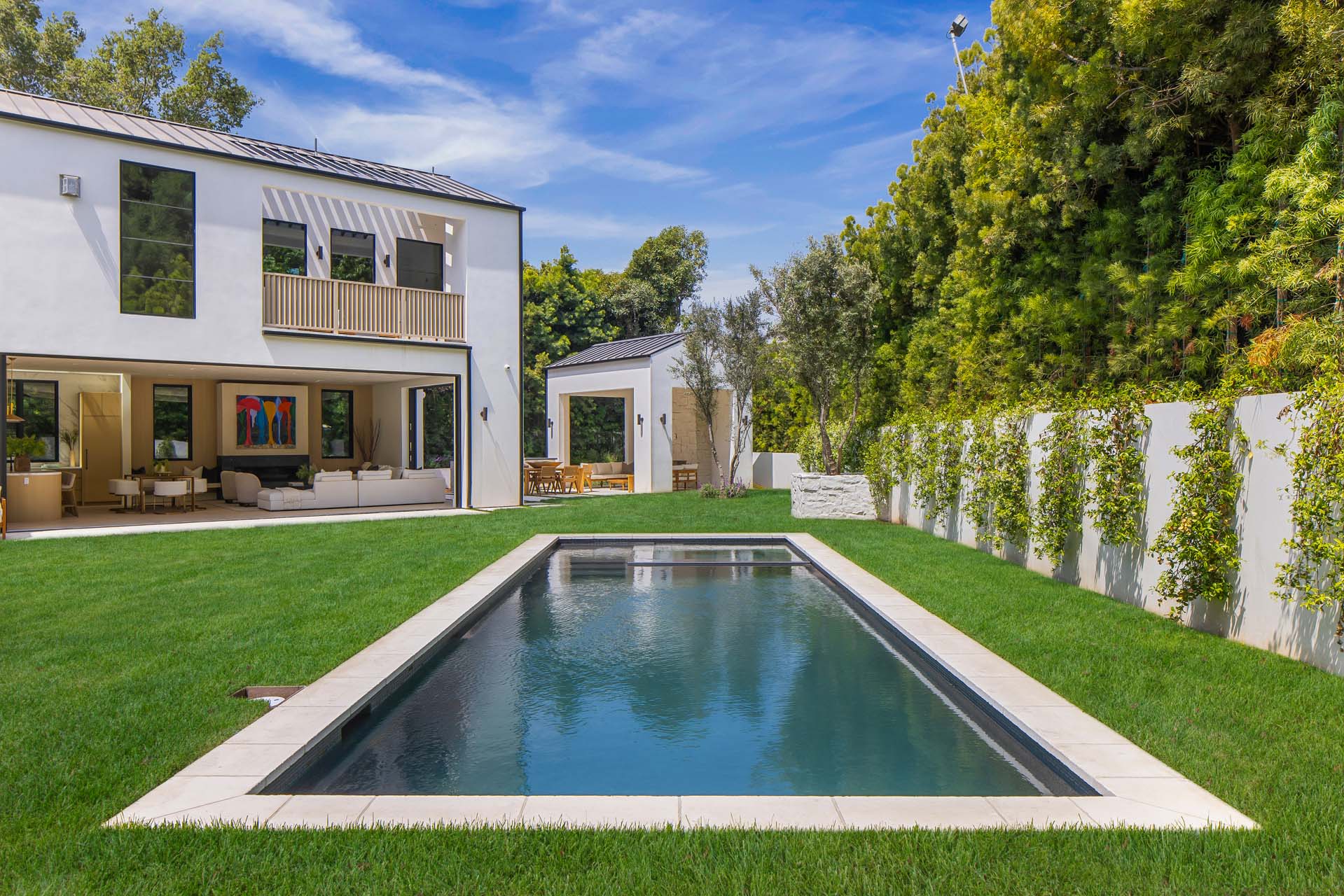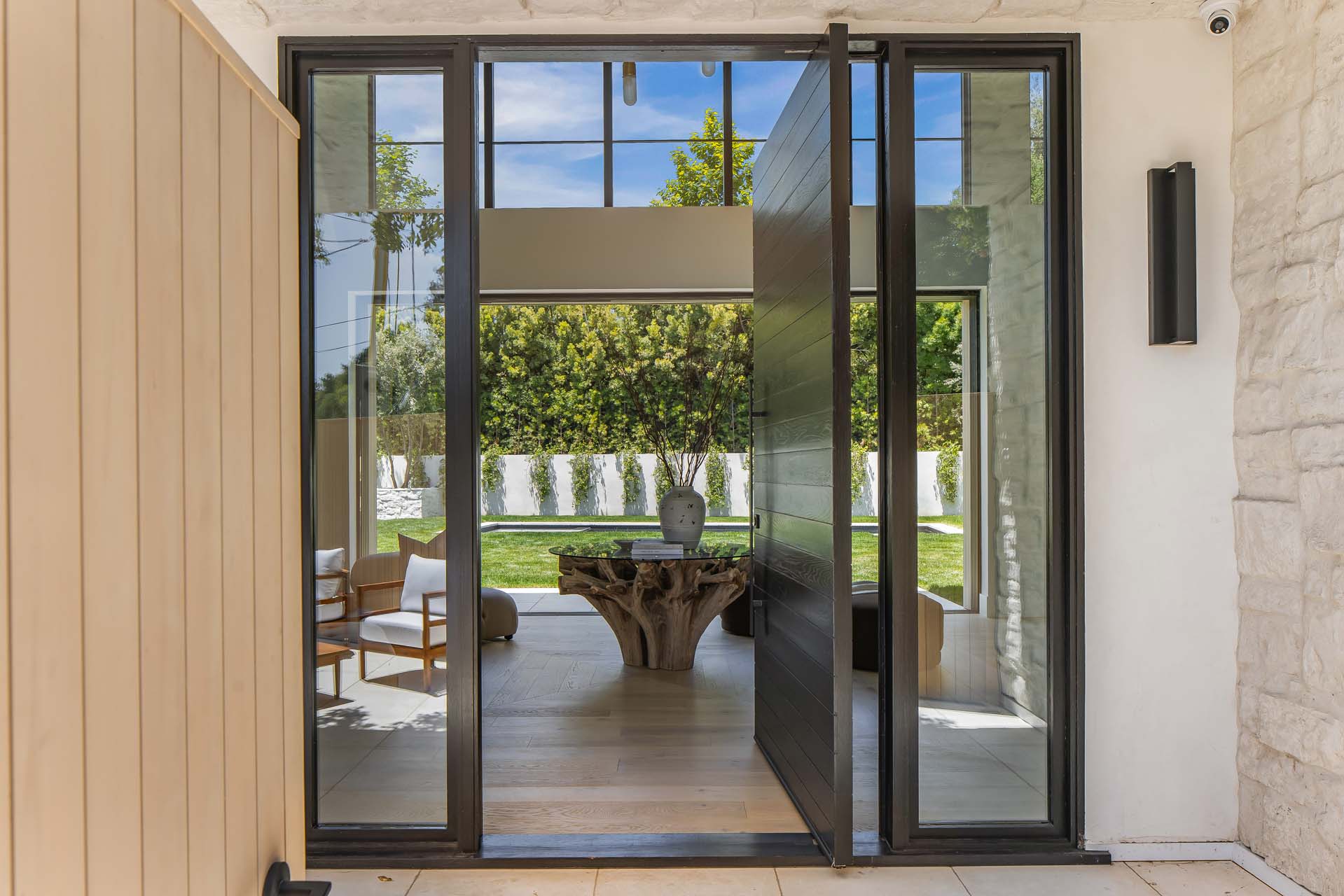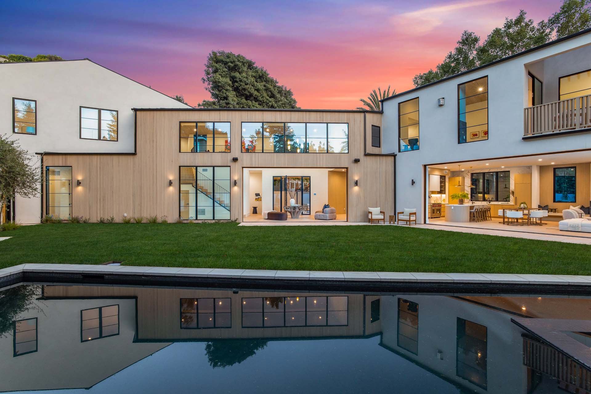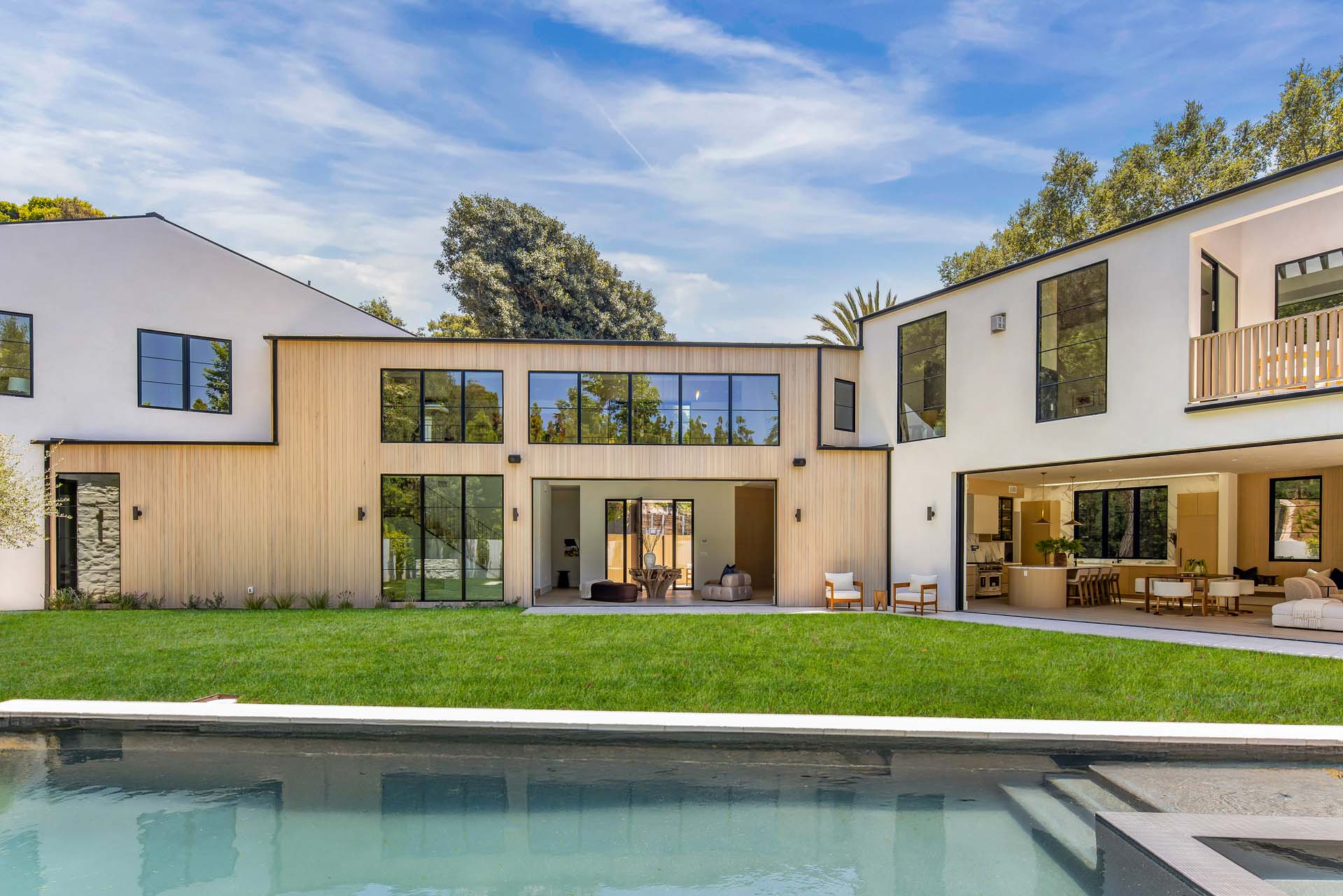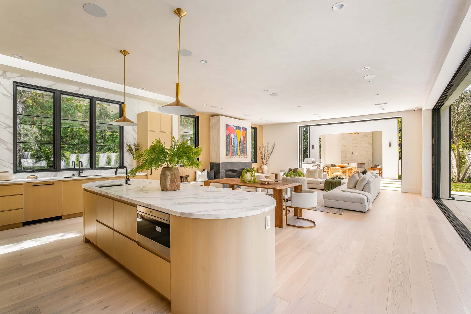 Nestled at the end of a quiet cul-de-sac on a tranquil lane just off the first block of lower Mandeville Canyon, this brand-new construction Modernist Farmhouse blends architectural sophistication with refined, organic design. Set on an expansive 18,000 square foot lot, this estate offers unparalleled privacy and sophistication in one of Brentwood’s most coveted neighborhoods. Crafted with meticulous attention to detail, the home’s handsome stone cladding and light wood accents seamlessly blend natural textures with contemporary design. A soaring two-story entry with exceptional volume welcomes you into a natural light-filled oasis, thoughtfully designed for both entertaining and everyday living. At the heart of the residence is an expansive great room with artisanal Roman clay ceiling, handsome Black Taj marble slab fireplace, and walls of pocketing Fleetwood glass doors leading to a resort-style backyard with elegant cabana and sparkling pool. Chef’s kitchen with Calacatta Aella marble finishes, state-of-the-art Sub-Zero and Wolf appliances, and an open-concept layout that ensures a seamless flow between the great room and formal dining room. Primary suite aerie with vaulted ceiling and elegant spa-inspired bathroom. Three additional bedroom suites up, each with luxurious baths showcasing Misterio marble finishes. Sophisticated downstairs powder room with artful, minimalist raked stucco walls and Lacava vessel sink. Spacious state-of-the-art screening room delivers a cinematic experience, while the Control4 smart home automation and built-in surround sound ensure effortless control of lighting, climate, security cameras, and entertainment. Expansive walls bathed in diffused natural light for a serious art collection. A singular, Brentwood estate blending glamorous indoor/outdoor living, comfort, and unparalleled amenities.