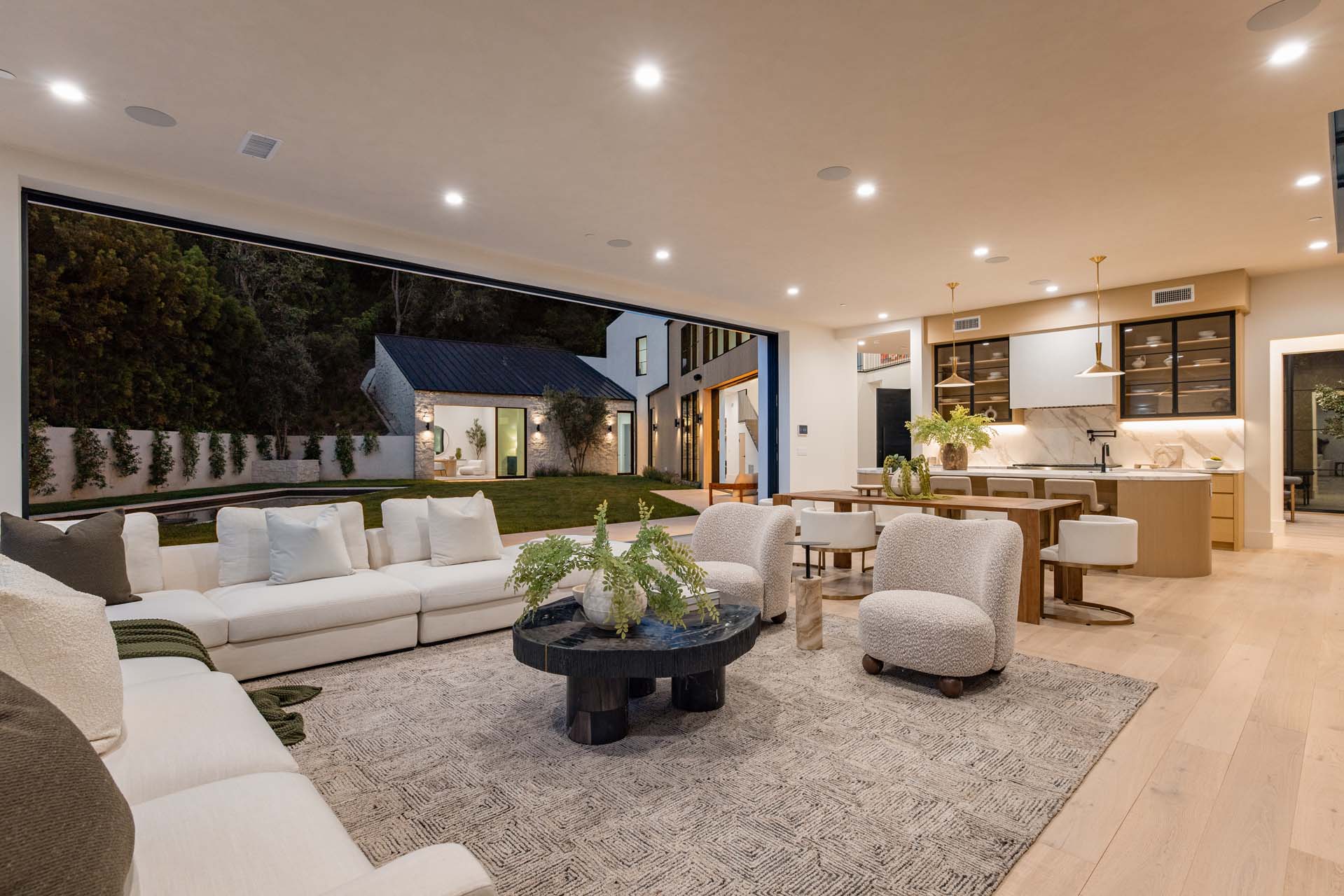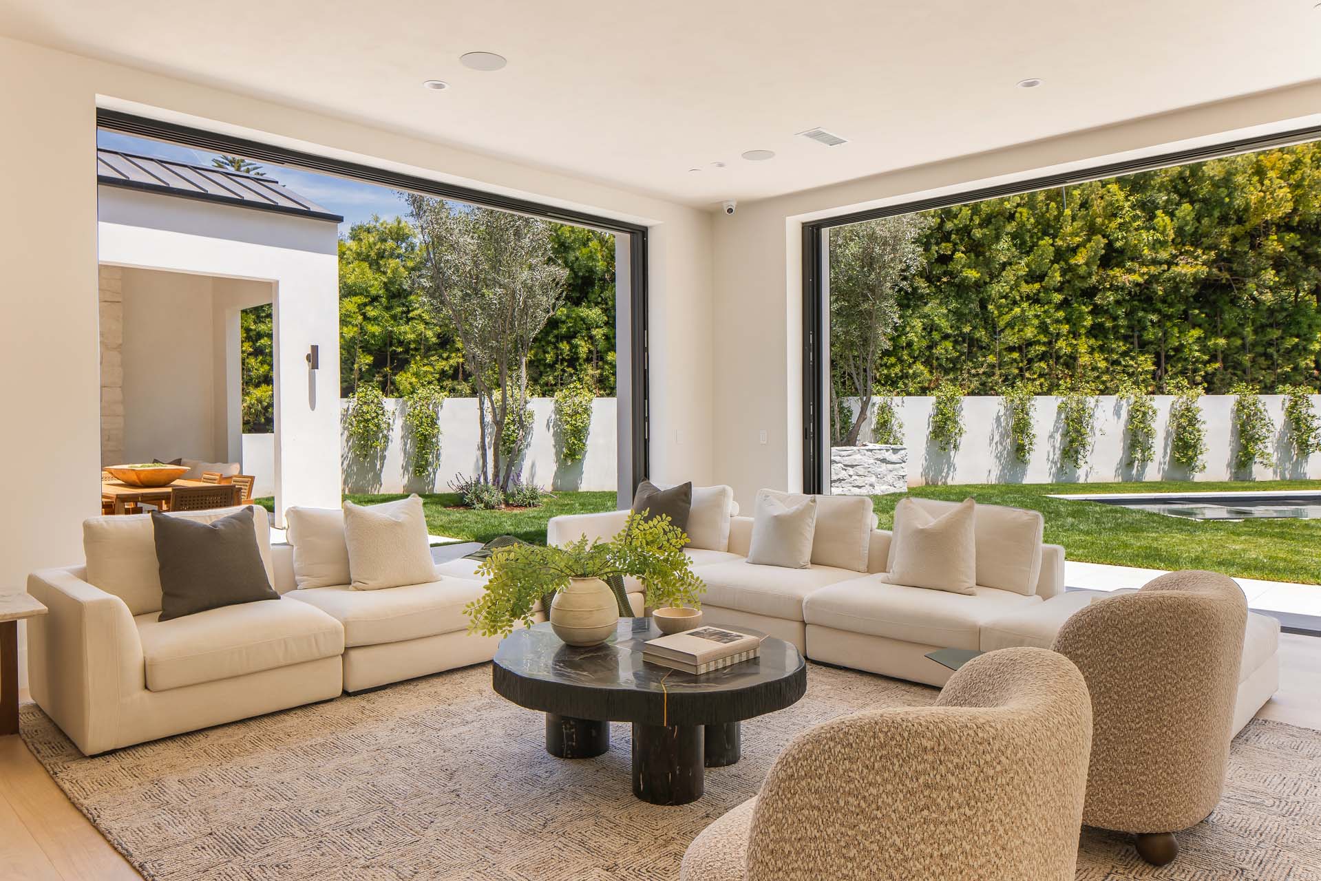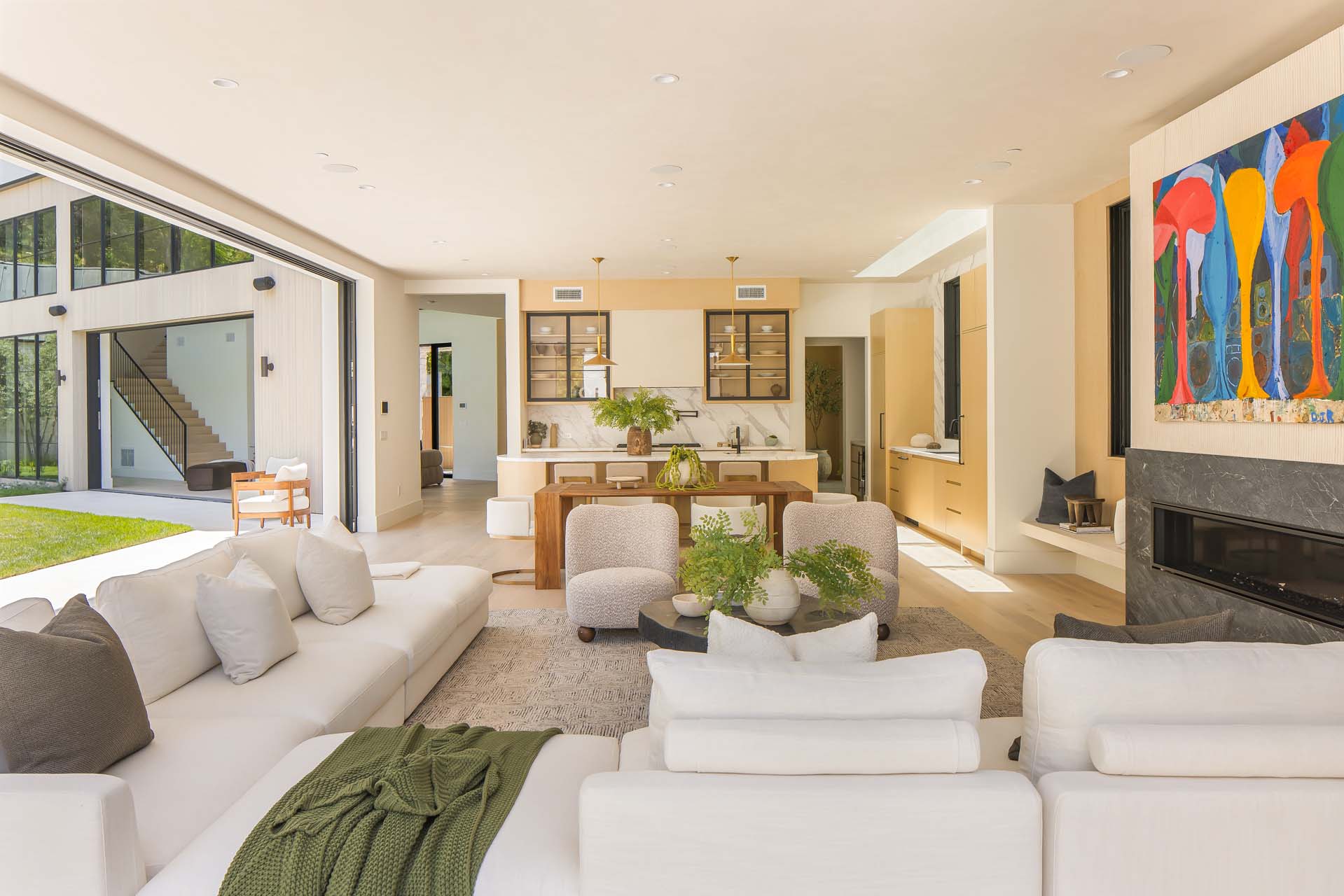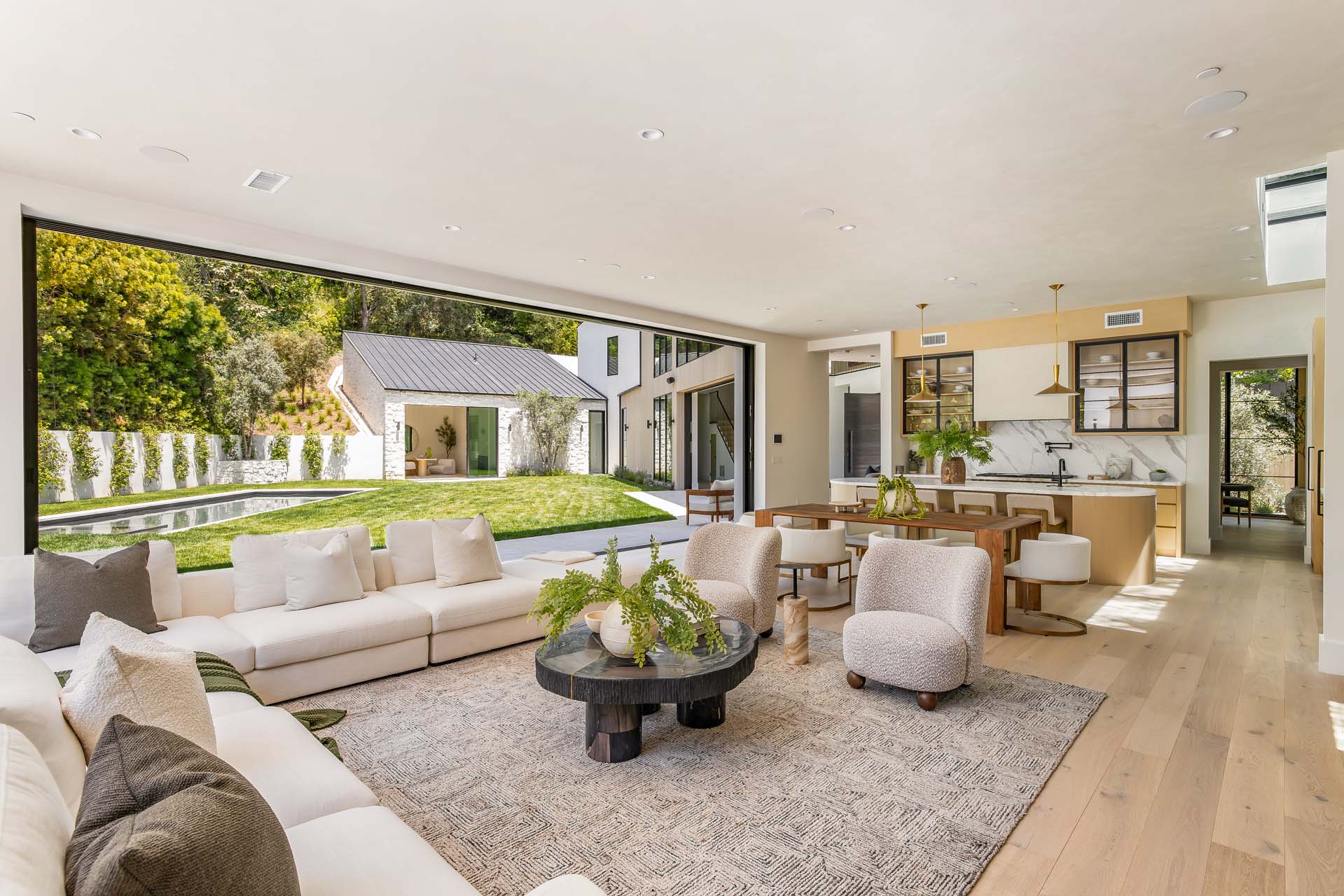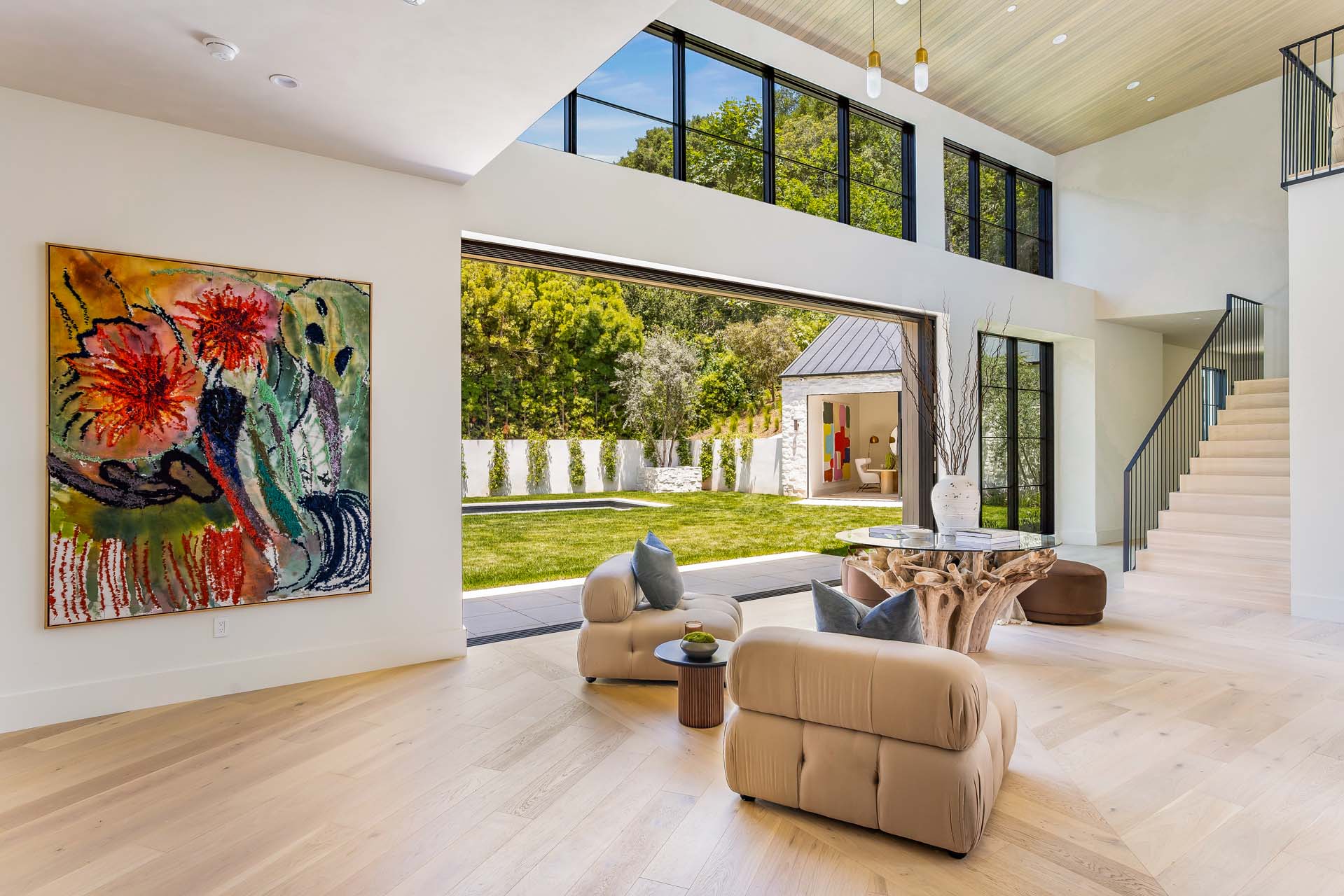 Nestled at the end of a quiet cul-de-sac on a tranquil lane just off the first block of lower Mandeville Canyon, this brand-new construction Modernist Farmhouse blends architectural sophistication with refined, organic design. Set on an expansive 18,000 square foot lot, this estate offers unparalleled privacy and sophistication in one of Brentwood’s most coveted neighborhoods. Crafted with meticulous attention to detail, the home’s handsome stone cladding and light wood accents seamlessly blend natural textures with contemporary design. A soaring two-story entry with exceptional volume welcomes you into a natural light-filled oasis, thoughtfully designed for both entertaining and everyday living. At the heart of the residence is an expansive great room with artisanal Roman clay ceiling, handsome Black Taj marble slab fireplace, and walls of pocketing Fleetwood glass doors leading to a resort-style backyard with elegant cabana and sparkling pool. Chef’s kitchen with Calacatta Aella marble finishes, state-of-the-art Sub-Zero and Wolf appliances, and an open-concept layout that ensures a seamless flow between the great room and formal dining room. Primary suite aerie with vaulted ceiling and elegant spa-inspired bathroom. Three additional bedroom suites up, each with luxurious baths showcasing Misterio marble finishes. Sophisticated downstairs powder room with artful, minimalist raked stucco walls and Lacava vessel sink. Spacious state-of-the-art screening room delivers a cinematic experience, while the Control4 smart home automation and built-in surround sound ensure effortless control of lighting, climate, security cameras, and entertainment. Expansive walls bathed in diffused natural light for a serious art collection. A singular, Brentwood estate blending glamorous indoor/outdoor living, comfort, and unparalleled amenities.