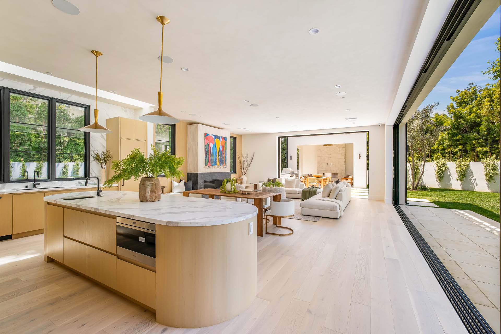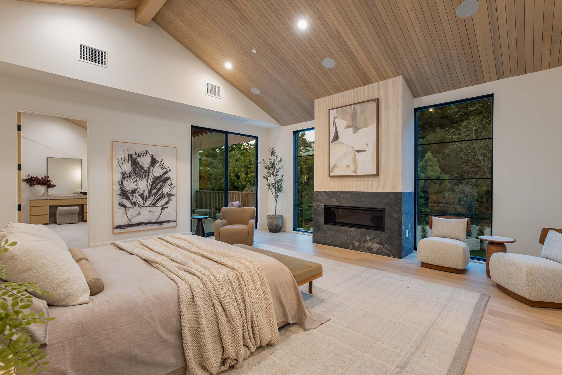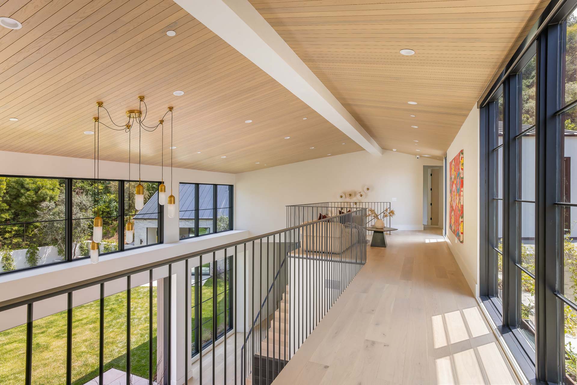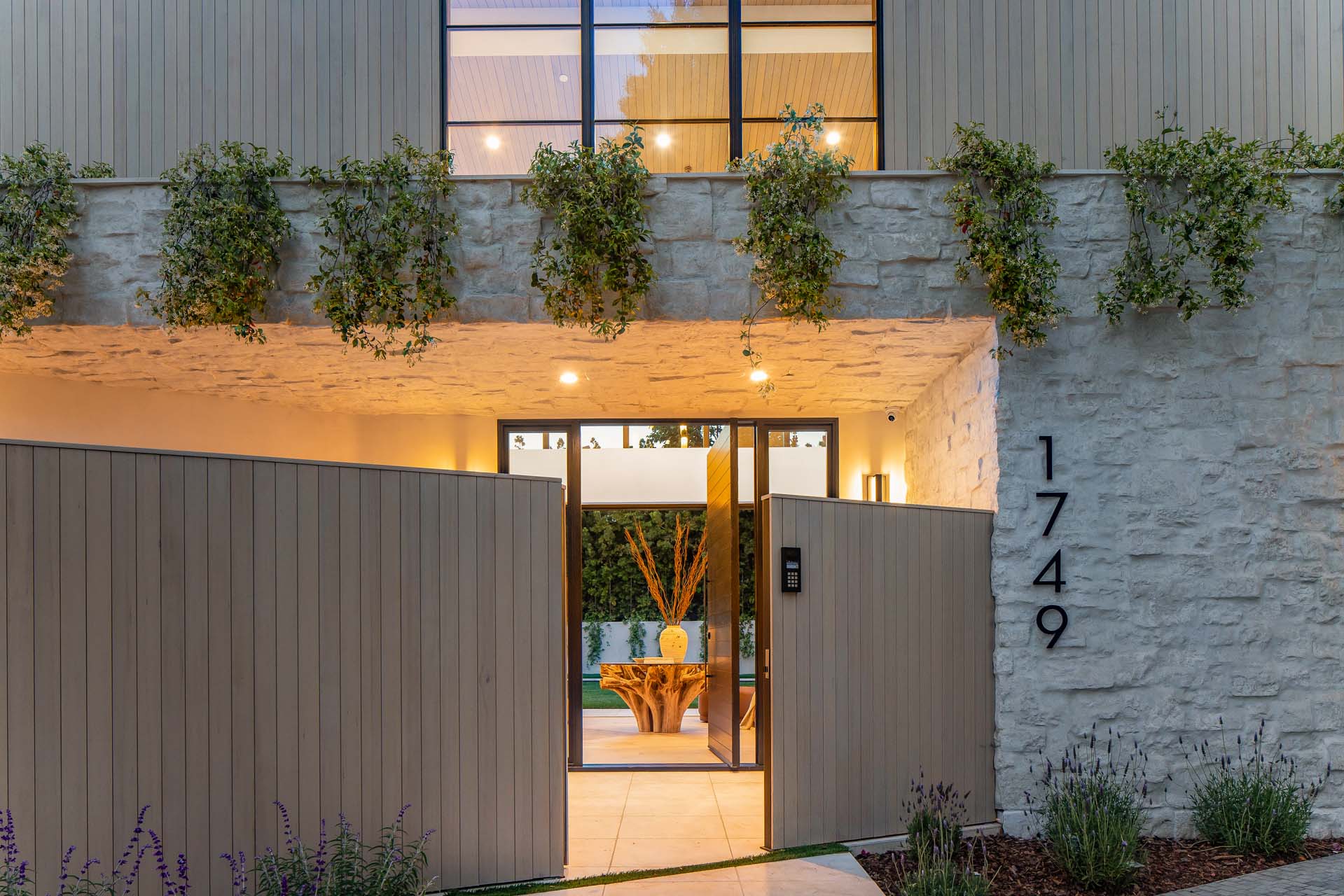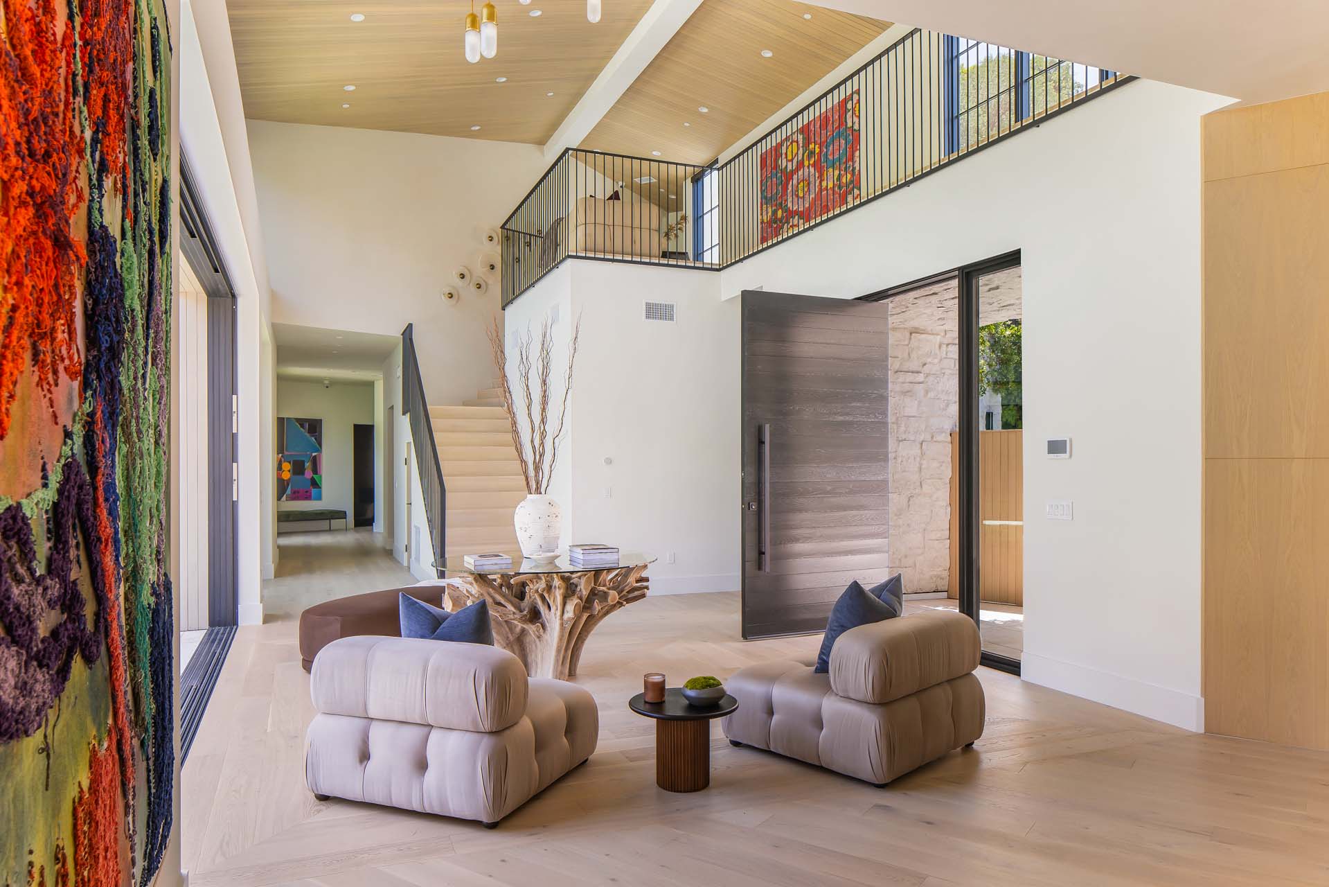 Nestled at the end of a quiet cul-de-sac on a tranquil lane just off the first block of lower Mandeville Canyon, this brand-new construction Modernist Farmhouse blends architectural sophistication with refined, organic design. Set on an expansive 18,000 square foot lot, this estate offers unparalleled privacy and sophistication in one of Brentwood’s most coveted neighborhoods. Crafted with meticulous attention to detail, the home’s handsome stone cladding and light wood accents seamlessly blend natural textures with contemporary design. A soaring two-story entry with exceptional volume welcomes you into a natural light-filled oasis, thoughtfully designed for both entertaining and everyday living. At the heart of the residence is an expansive great room with artisanal Roman clay ceiling, handsome Black Taj marble slab fireplace, and walls of pocketing Fleetwood glass doors leading to a resort-style backyard with elegant cabana and sparkling pool. Chef’s kitchen with Calacatta Aella marble finishes, state-of-the-art Sub-Zero and Wolf appliances, and an open-concept layout that ensures a seamless flow between the great room and formal dining room. Primary suite aerie with vaulted ceiling and elegant spa-inspired bathroom. Three additional bedroom suites up, each with luxurious baths showcasing Misterio marble finishes. Sophisticated downstairs powder room with artful, minimalist raked stucco walls and Lacava vessel sink. Spacious state-of-the-art screening room delivers a cinematic experience, while the Control4 smart home automation and built-in surround sound ensure effortless control of lighting, climate, security cameras, and entertainment. Expansive walls bathed in diffused natural light for a serious art collection. A singular, Brentwood estate blending glamorous indoor/outdoor living, comfort, and unparalleled amenities.