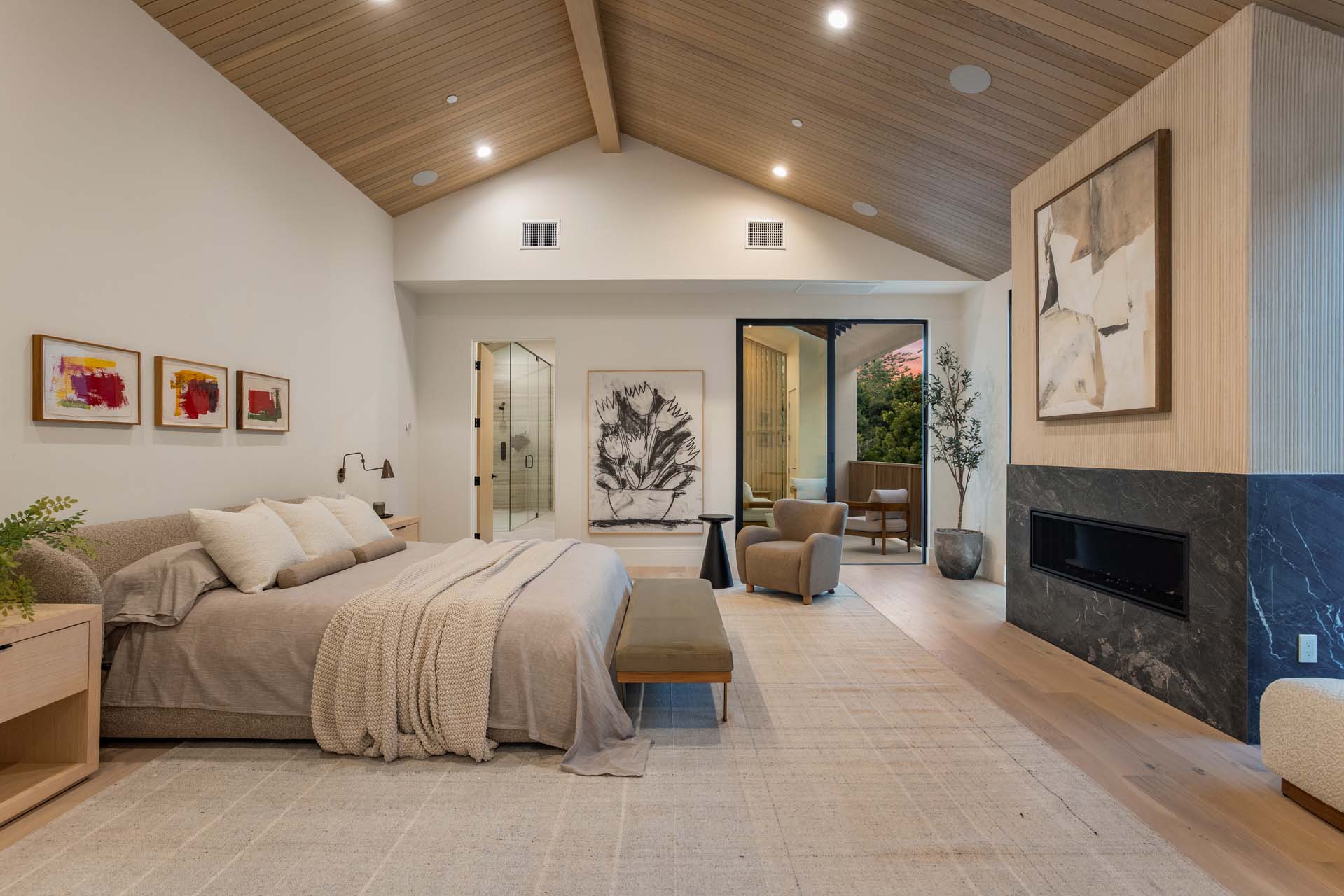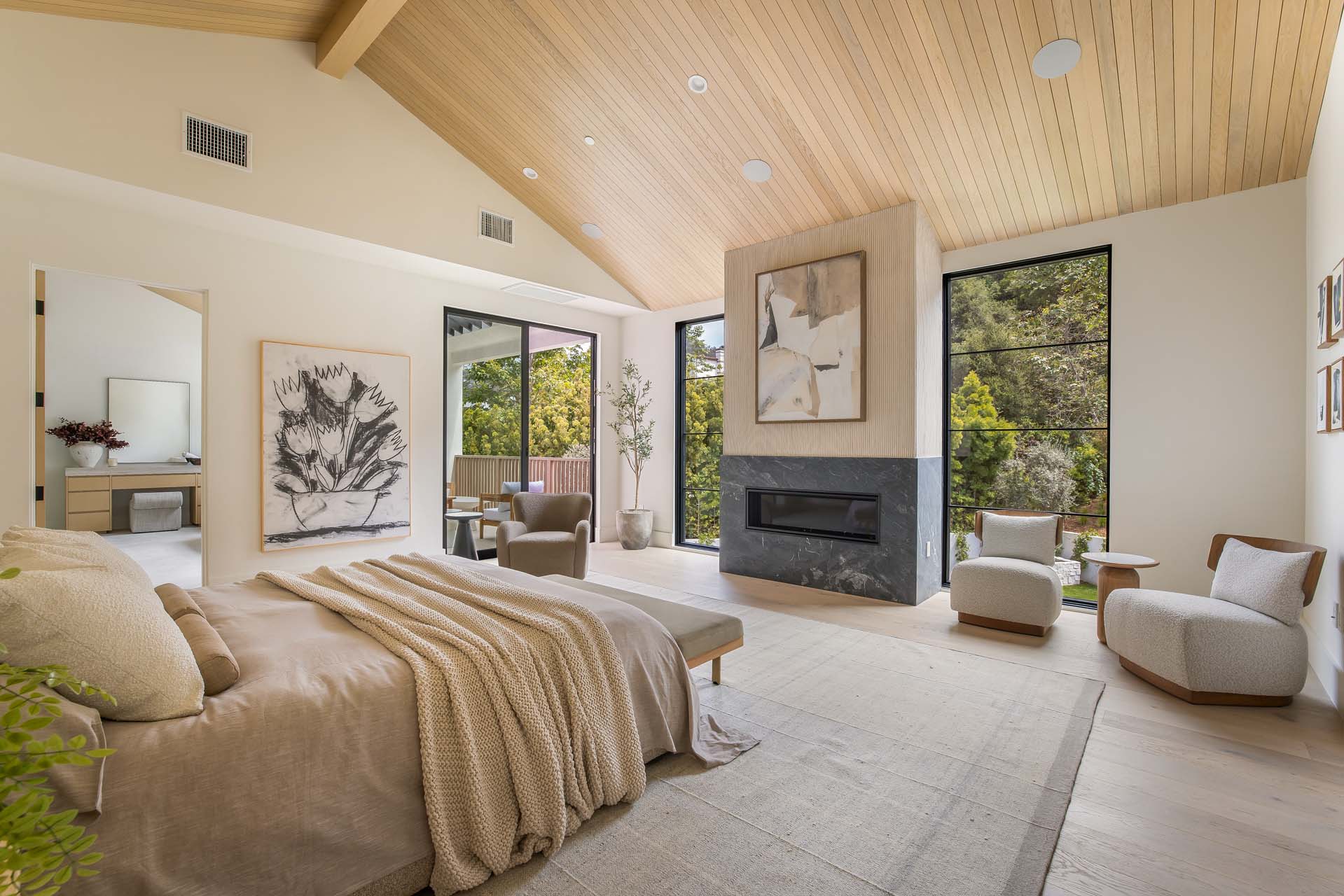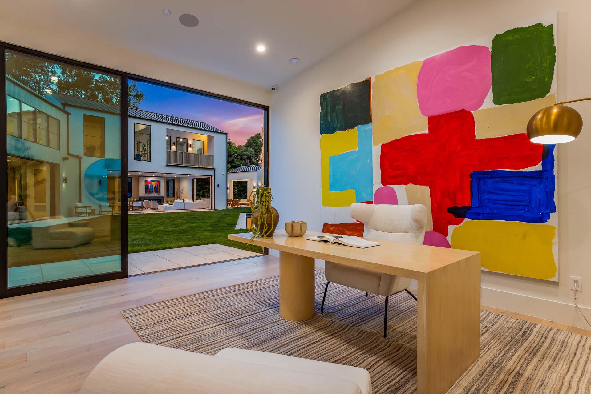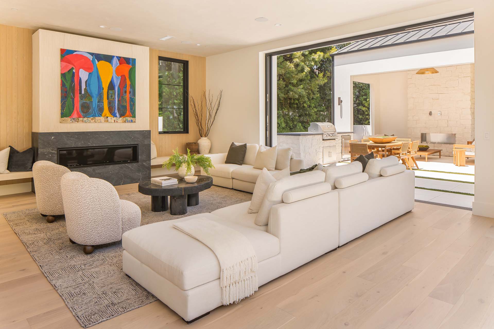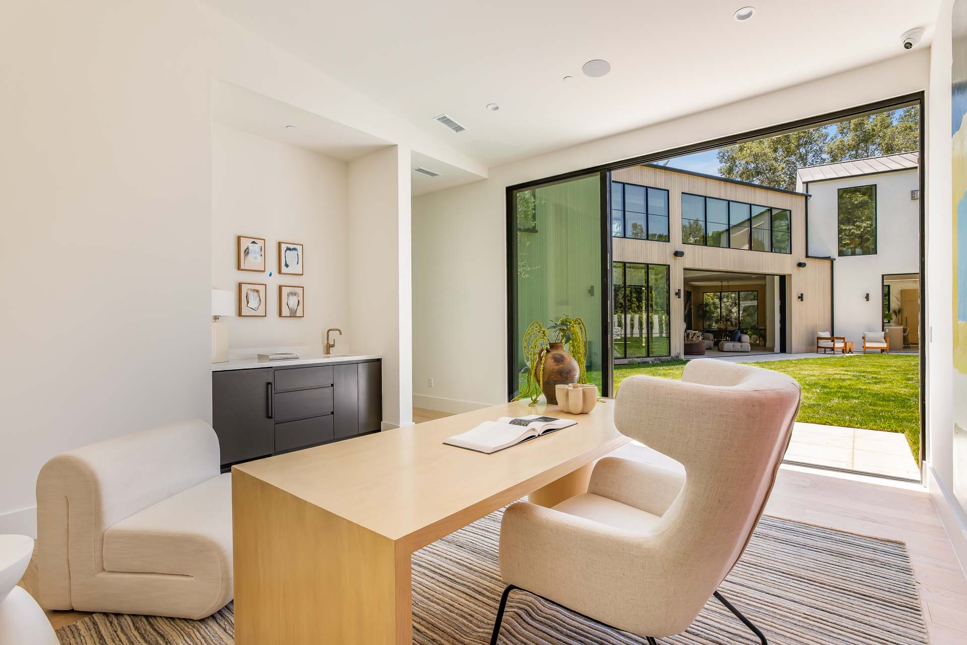 Nestled at the end of a quiet cul-de-sac on a tranquil lane just off the first block of lower Mandeville Canyon, this brand-new construction Modernist Farmhouse blends architectural sophistication with refined, organic design. Set on an expansive 18,000 square foot lot, this estate offers unparalleled privacy and sophistication in one of Brentwood’s most coveted neighborhoods. Crafted with meticulous attention to detail, the home’s handsome stone cladding and light wood accents seamlessly blend natural textures with contemporary design. A soaring two-story entry with exceptional volume welcomes you into a natural light-filled oasis, thoughtfully designed for both entertaining and everyday living. At the heart of the residence is an expansive great room with artisanal Roman clay ceiling, handsome Black Taj marble slab fireplace, and walls of pocketing Fleetwood glass doors leading to a resort-style backyard with elegant cabana and sparkling pool. Chef’s kitchen with Calacatta Aella marble finishes, state-of-the-art Sub-Zero and Wolf appliances, and an open-concept layout that ensures a seamless flow between the great room and formal dining room. Primary suite aerie with vaulted ceiling and elegant spa-inspired bathroom. Three additional bedroom suites up, each with luxurious baths showcasing Misterio marble finishes. Sophisticated downstairs powder room with artful, minimalist raked stucco walls and Lacava vessel sink. Spacious state-of-the-art screening room delivers a cinematic experience, while the Control4 smart home automation and built-in surround sound ensure effortless control of lighting, climate, security cameras, and entertainment. Expansive walls bathed in diffused natural light for a serious art collection. A singular, Brentwood estate blending glamorous indoor/outdoor living, comfort, and unparalleled amenities.