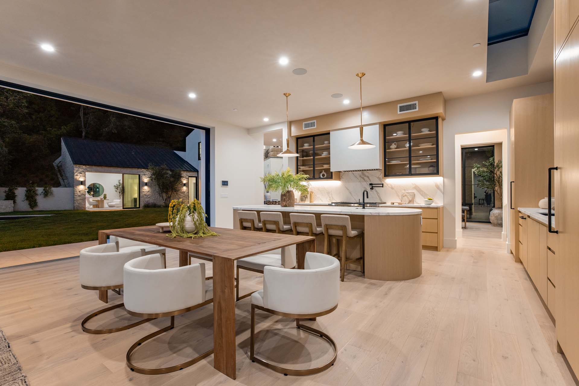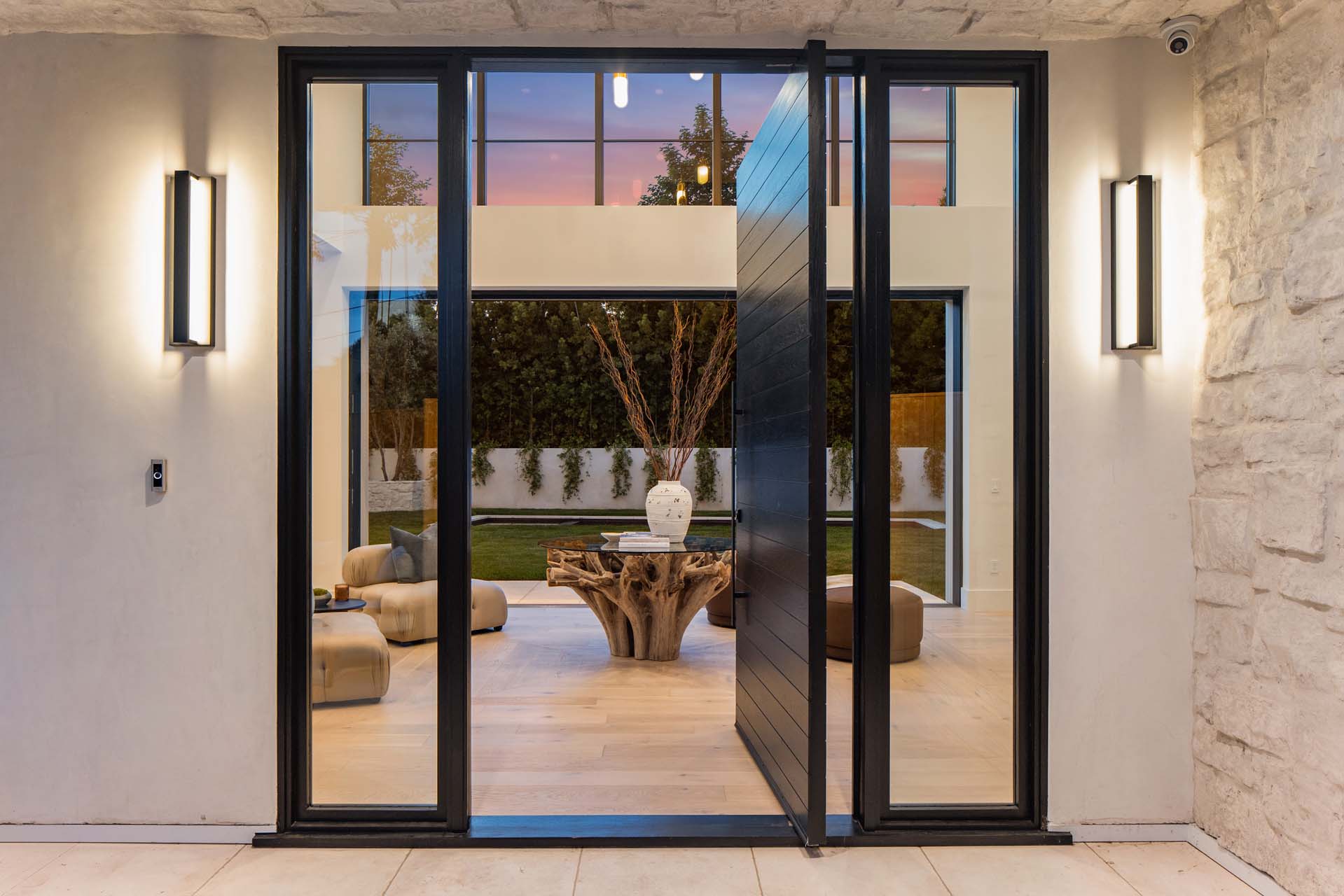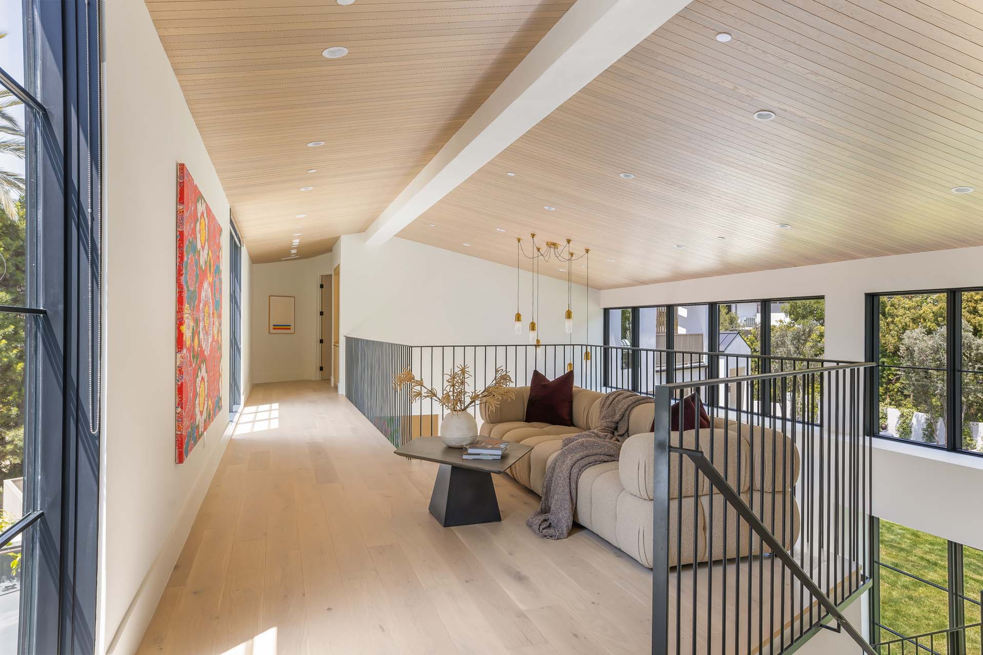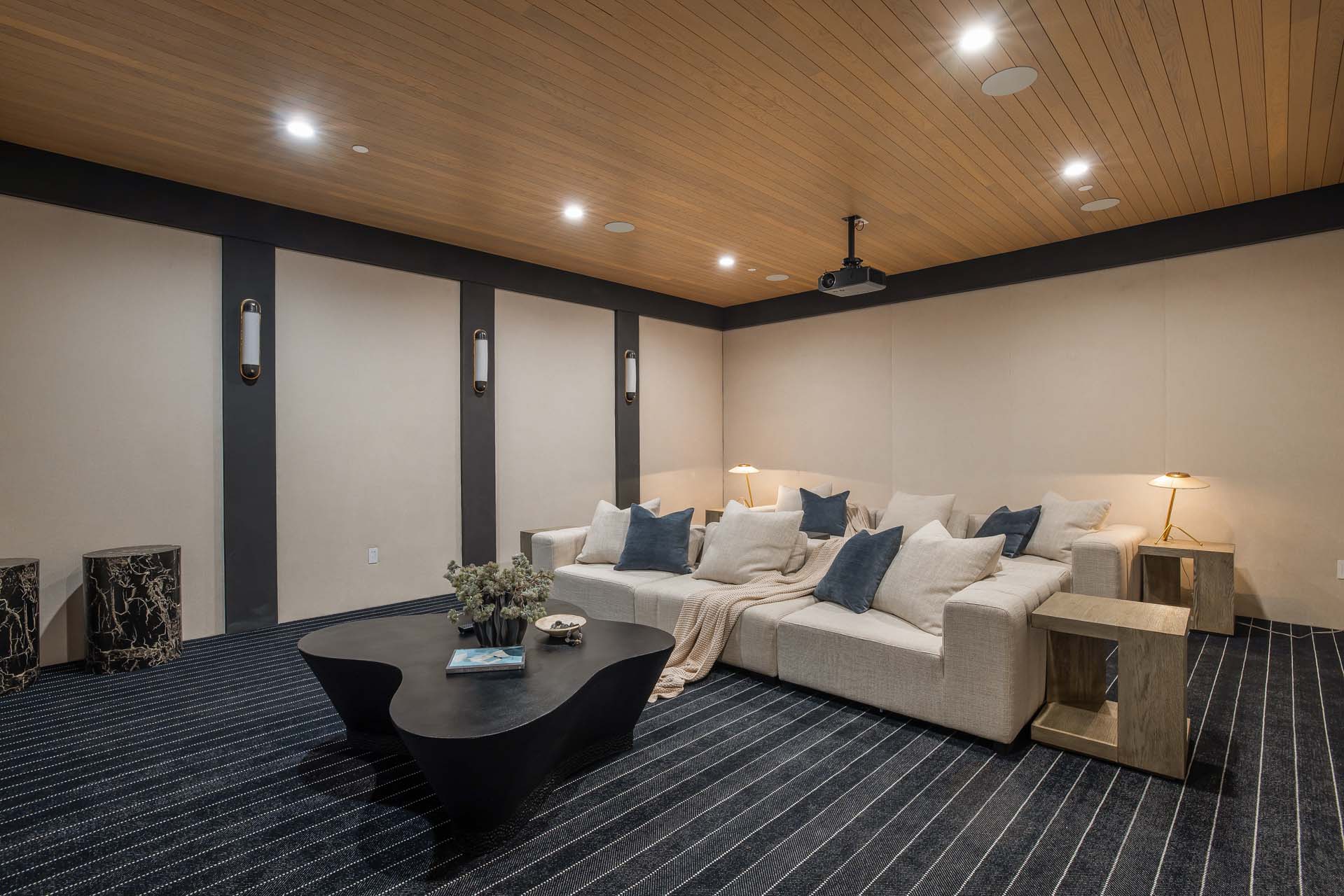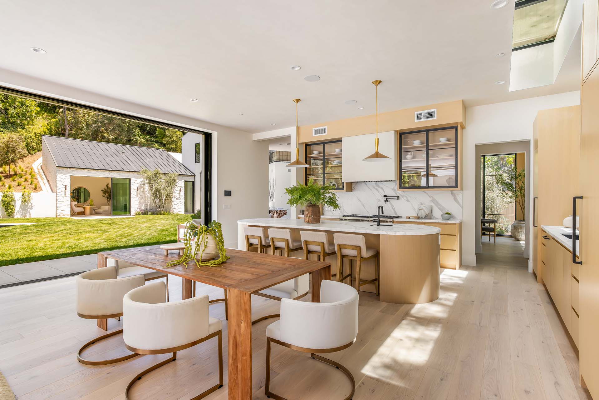 Nestled at the end of a quiet cul-de-sac on a tranquil lane just off the first block of lower Mandeville Canyon, this brand-new construction Modernist Farmhouse blends architectural sophistication with refined, organic design. Set on an expansive 18,000 square foot lot, this estate offers unparalleled privacy and sophistication in one of Brentwood’s most coveted neighborhoods. Crafted with meticulous attention to detail, the home’s handsome stone cladding and light wood accents seamlessly blend natural textures with contemporary design. A soaring two-story entry with exceptional volume welcomes you into a natural light-filled oasis, thoughtfully designed for both entertaining and everyday living. At the heart of the residence is an expansive great room with artisanal Roman clay ceiling, handsome Black Taj marble slab fireplace, and walls of pocketing Fleetwood glass doors leading to a resort-style backyard with elegant cabana and sparkling pool. Chef’s kitchen with Calacatta Aella marble finishes, state-of-the-art Sub-Zero and Wolf appliances, and an open-concept layout that ensures a seamless flow between the great room and formal dining room. Primary suite aerie with vaulted ceiling and elegant spa-inspired bathroom. Three additional bedroom suites up, each with luxurious baths showcasing Misterio marble finishes. Sophisticated downstairs powder room with artful, minimalist raked stucco walls and Lacava vessel sink. Spacious state-of-the-art screening room delivers a cinematic experience, while the Control4 smart home automation and built-in surround sound ensure effortless control of lighting, climate, security cameras, and entertainment. Expansive walls bathed in diffused natural light for a serious art collection. A singular, Brentwood estate blending glamorous indoor/outdoor living, comfort, and unparalleled amenities.
