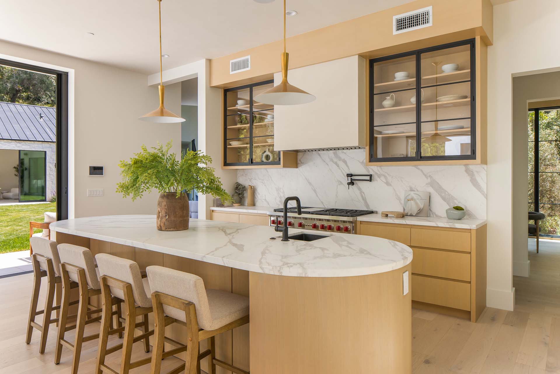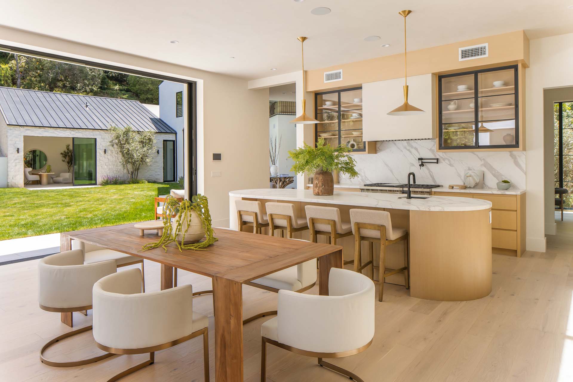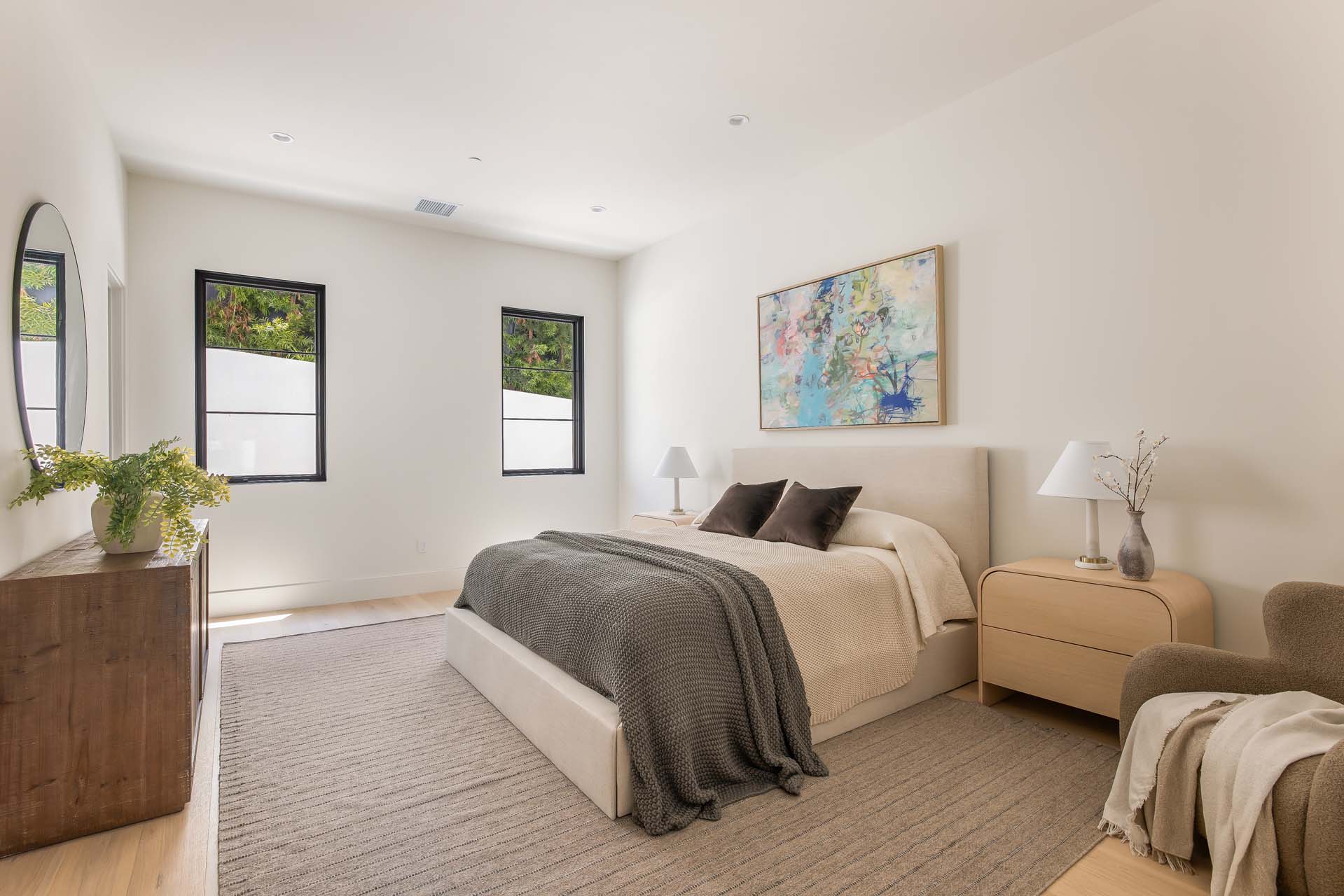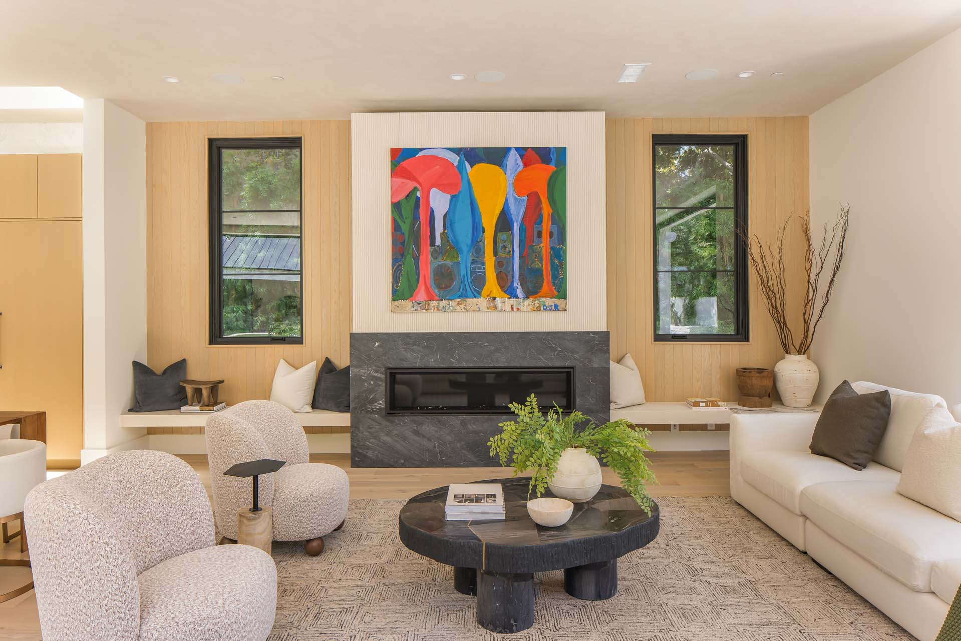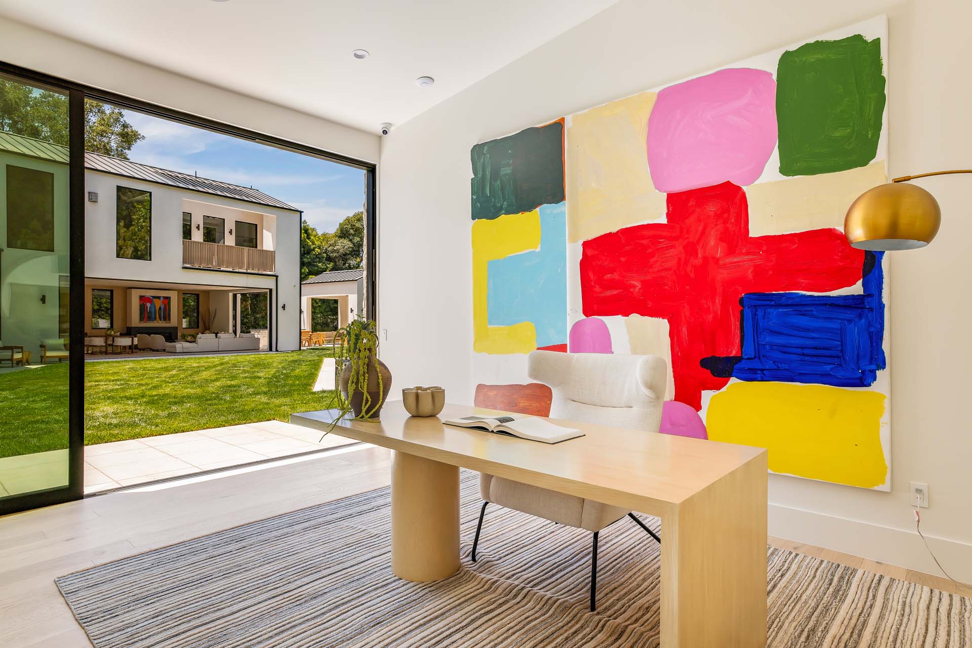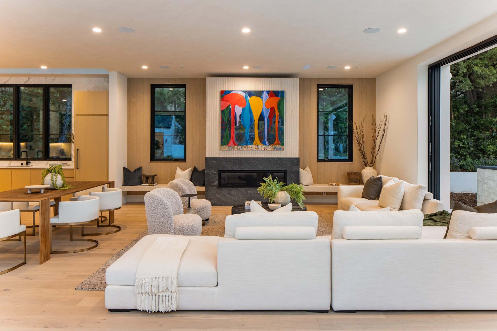 Nestled at the end of a quiet cul-de-sac on a tranquil lane just off the first block of lower Mandeville Canyon, this brand-new construction Modernist Farmhouse blends architectural sophistication with refined, organic design. Set on an expansive 18,000 square foot lot, this estate offers unparalleled privacy and sophistication in one of Brentwood’s most coveted neighborhoods. Crafted with meticulous attention to detail, the home’s handsome stone cladding and light wood accents seamlessly blend natural textures with contemporary design. A soaring two-story entry with exceptional volume welcomes you into a natural light-filled oasis, thoughtfully designed for both entertaining and everyday living. At the heart of the residence is an expansive great room with artisanal Roman clay ceiling, handsome Black Taj marble slab fireplace, and walls of pocketing Fleetwood glass doors leading to a resort-style backyard with elegant cabana and sparkling pool. Chef’s kitchen with Calacatta Aella marble finishes, state-of-the-art Sub-Zero and Wolf appliances, and an open-concept layout that ensures a seamless flow between the great room and formal dining room. Primary suite aerie with vaulted ceiling and elegant spa-inspired bathroom. Three additional bedroom suites up, each with luxurious baths showcasing Misterio marble finishes. Sophisticated downstairs powder room with artful, minimalist raked stucco walls and Lacava vessel sink. Spacious state-of-the-art screening room delivers a cinematic experience, while the Control4 smart home automation and built-in surround sound ensure effortless control of lighting, climate, security cameras, and entertainment. Expansive walls bathed in diffused natural light for a serious art collection. A singular, Brentwood estate blending glamorous indoor/outdoor living, comfort, and unparalleled amenities.