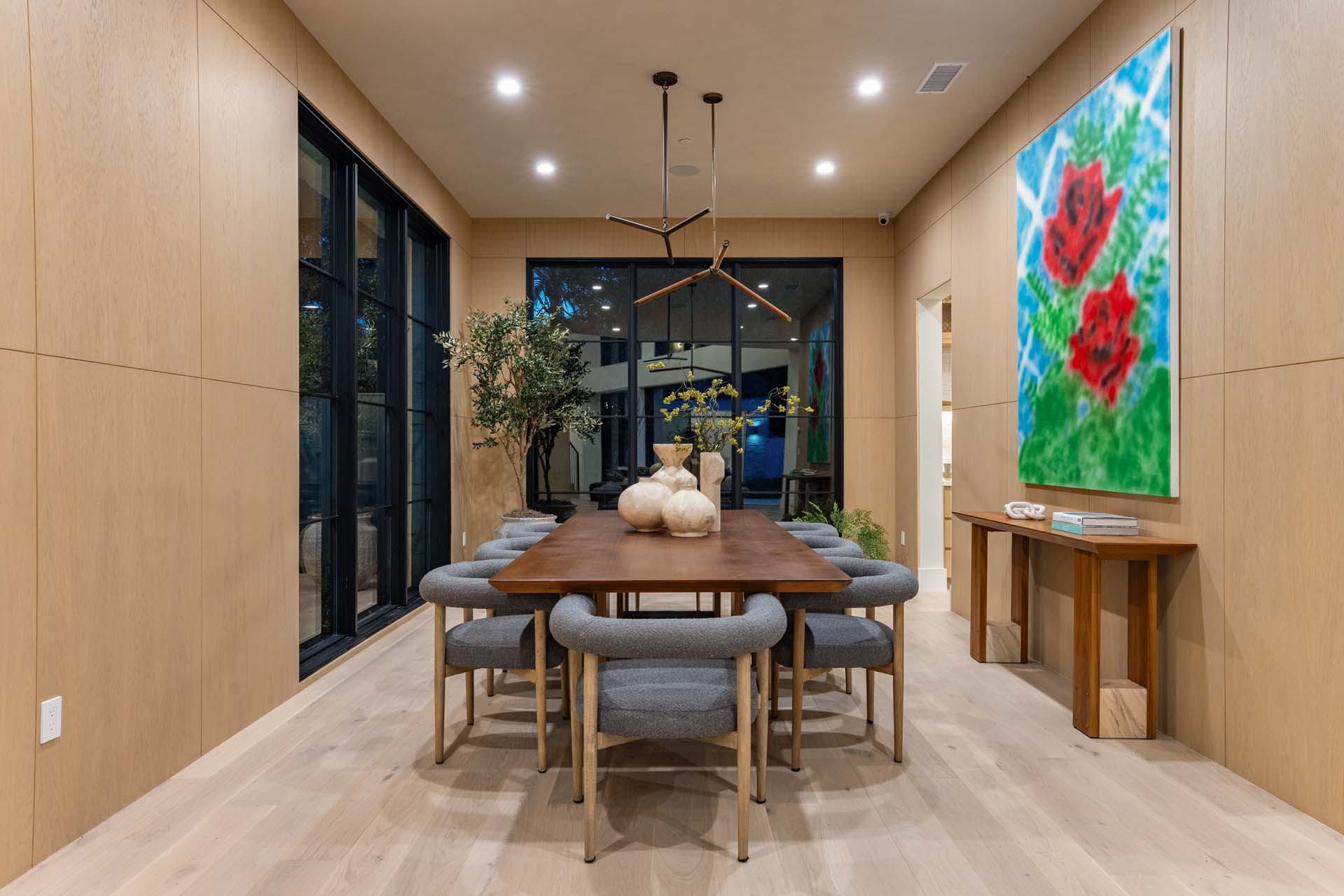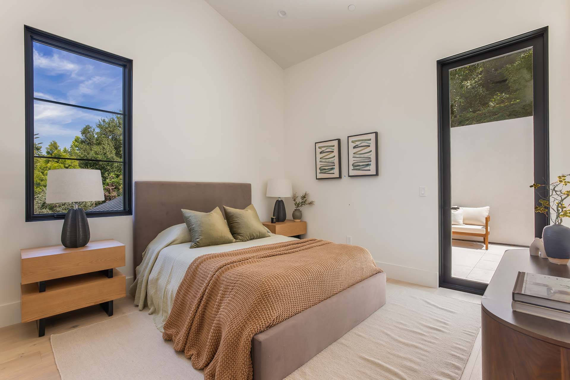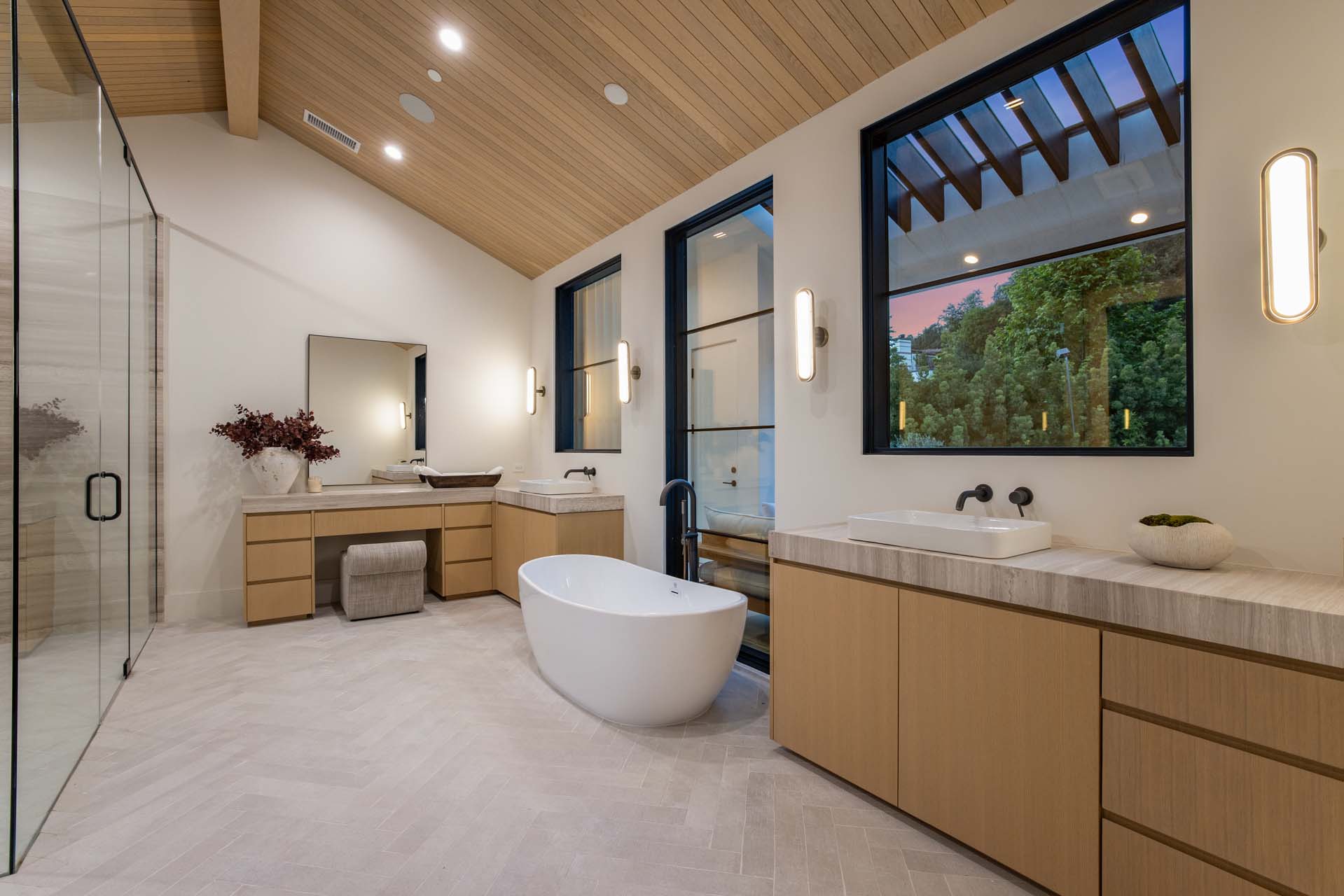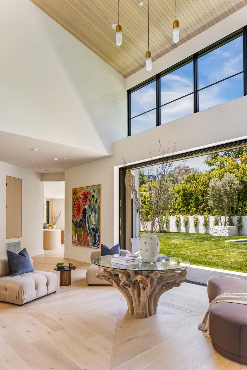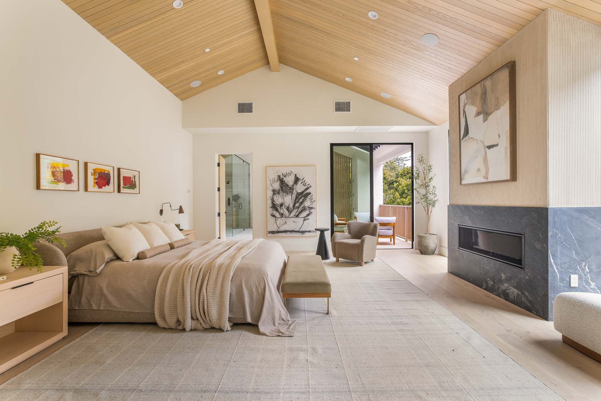 Nestled at the end of a quiet cul-de-sac on a tranquil lane just off the first block of lower Mandeville Canyon, this brand-new construction Modernist Farmhouse blends architectural sophistication with refined, organic design. Set on an expansive 18,000 square foot lot, this estate offers unparalleled privacy and sophistication in one of Brentwood’s most coveted neighborhoods. Crafted with meticulous attention to detail, the home’s handsome stone cladding and light wood accents seamlessly blend natural textures with contemporary design. A soaring two-story entry with exceptional volume welcomes you into a natural light-filled oasis, thoughtfully designed for both entertaining and everyday living. At the heart of the residence is an expansive great room with artisanal Roman clay ceiling, handsome Black Taj marble slab fireplace, and walls of pocketing Fleetwood glass doors leading to a resort-style backyard with elegant cabana and sparkling pool. Chef’s kitchen with Calacatta Aella marble finishes, state-of-the-art Sub-Zero and Wolf appliances, and an open-concept layout that ensures a seamless flow between the great room and formal dining room. Primary suite aerie with vaulted ceiling and elegant spa-inspired bathroom. Three additional bedroom suites up, each with luxurious baths showcasing Misterio marble finishes. Sophisticated downstairs powder room with artful, minimalist raked stucco walls and Lacava vessel sink. Spacious state-of-the-art screening room delivers a cinematic experience, while the Control4 smart home automation and built-in surround sound ensure effortless control of lighting, climate, security cameras, and entertainment. Expansive walls bathed in diffused natural light for a serious art collection. A singular, Brentwood estate blending glamorous indoor/outdoor living, comfort, and unparalleled amenities.