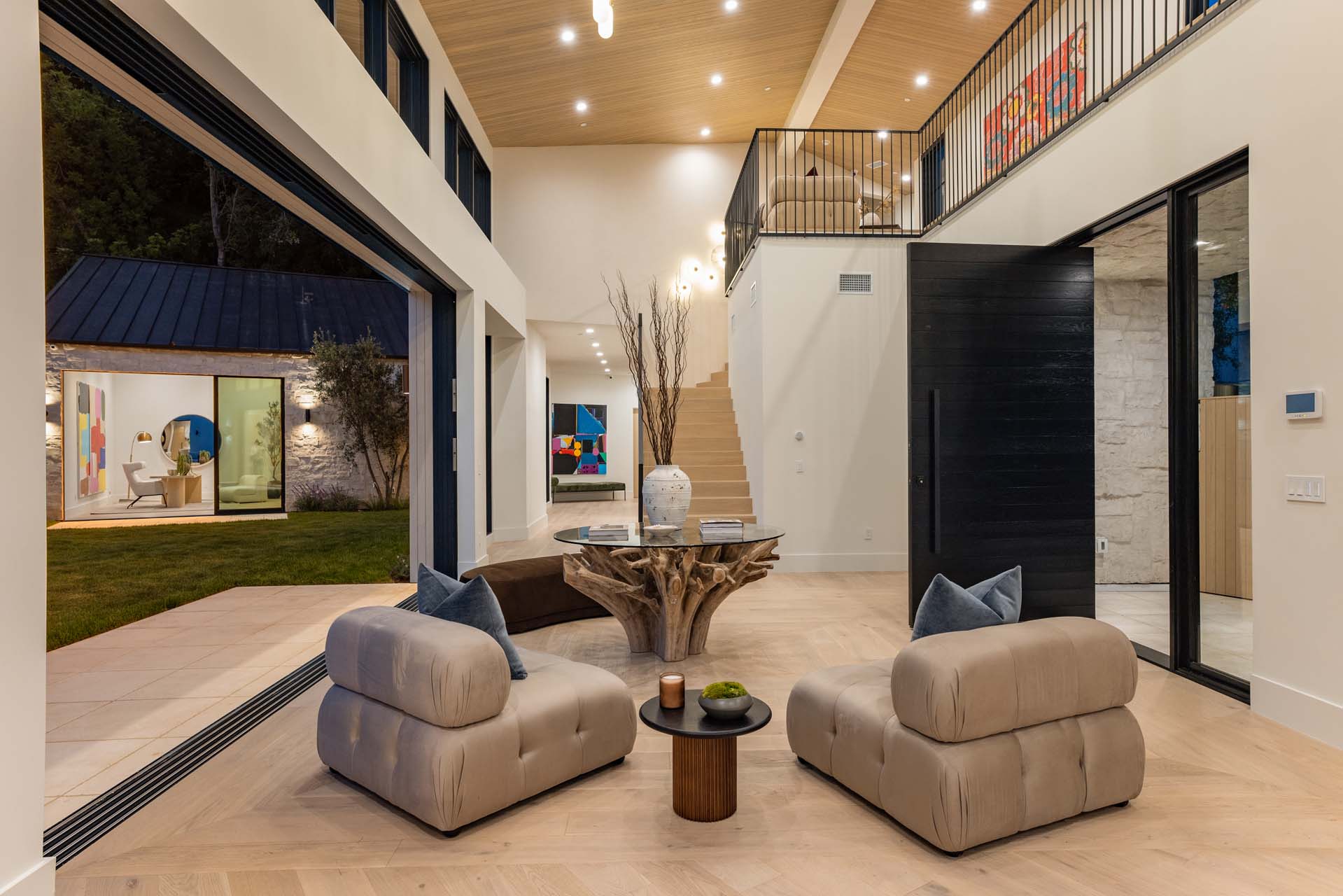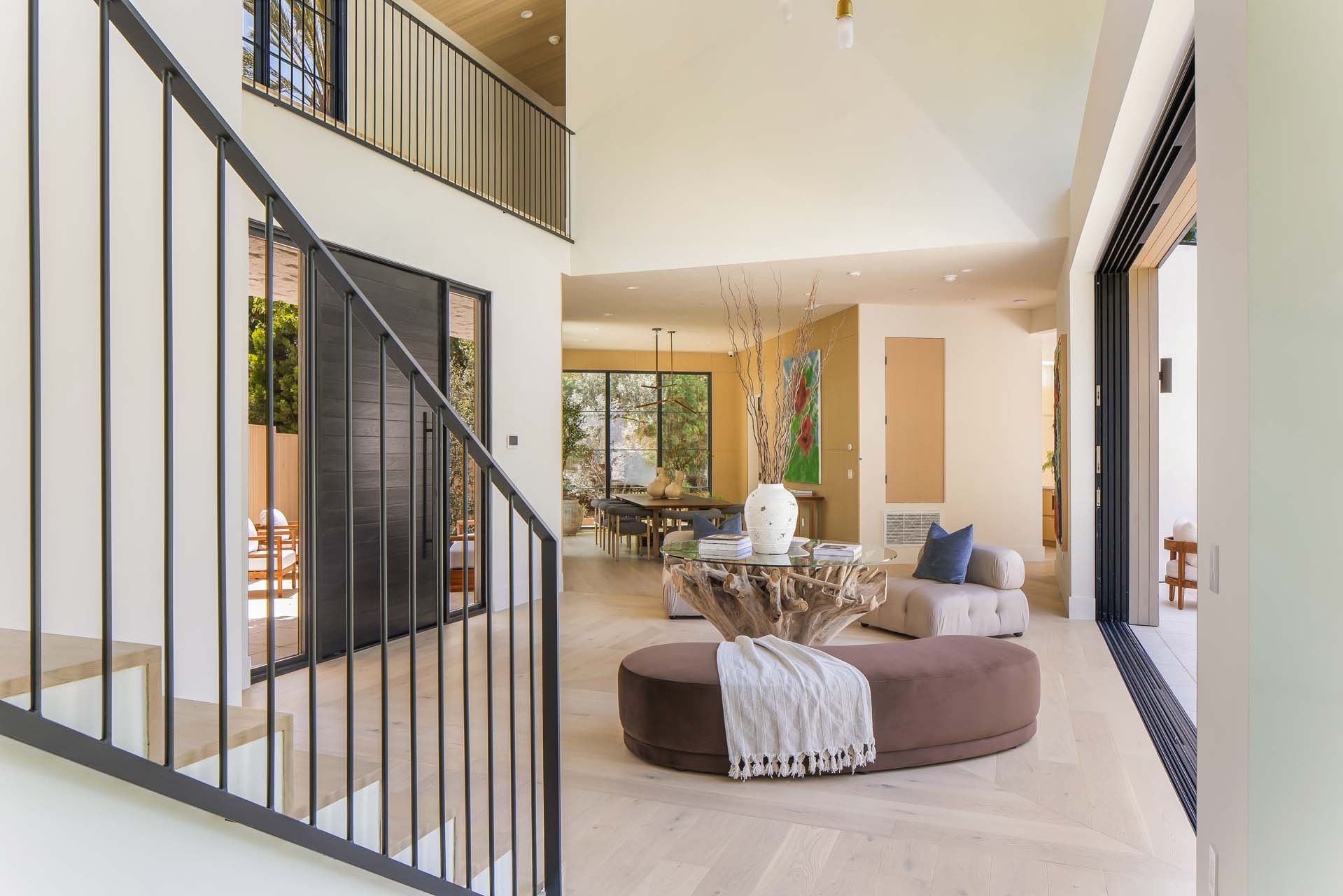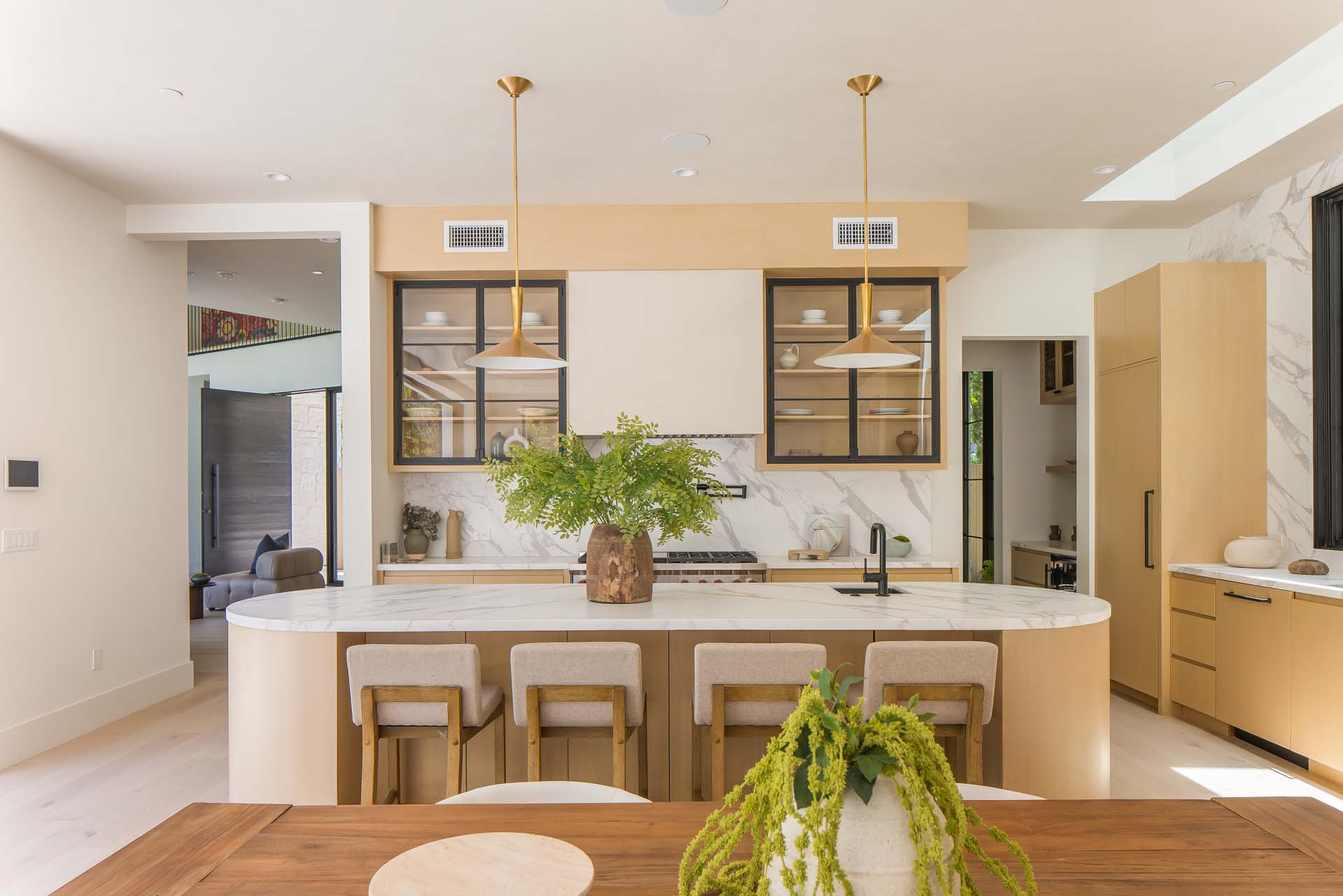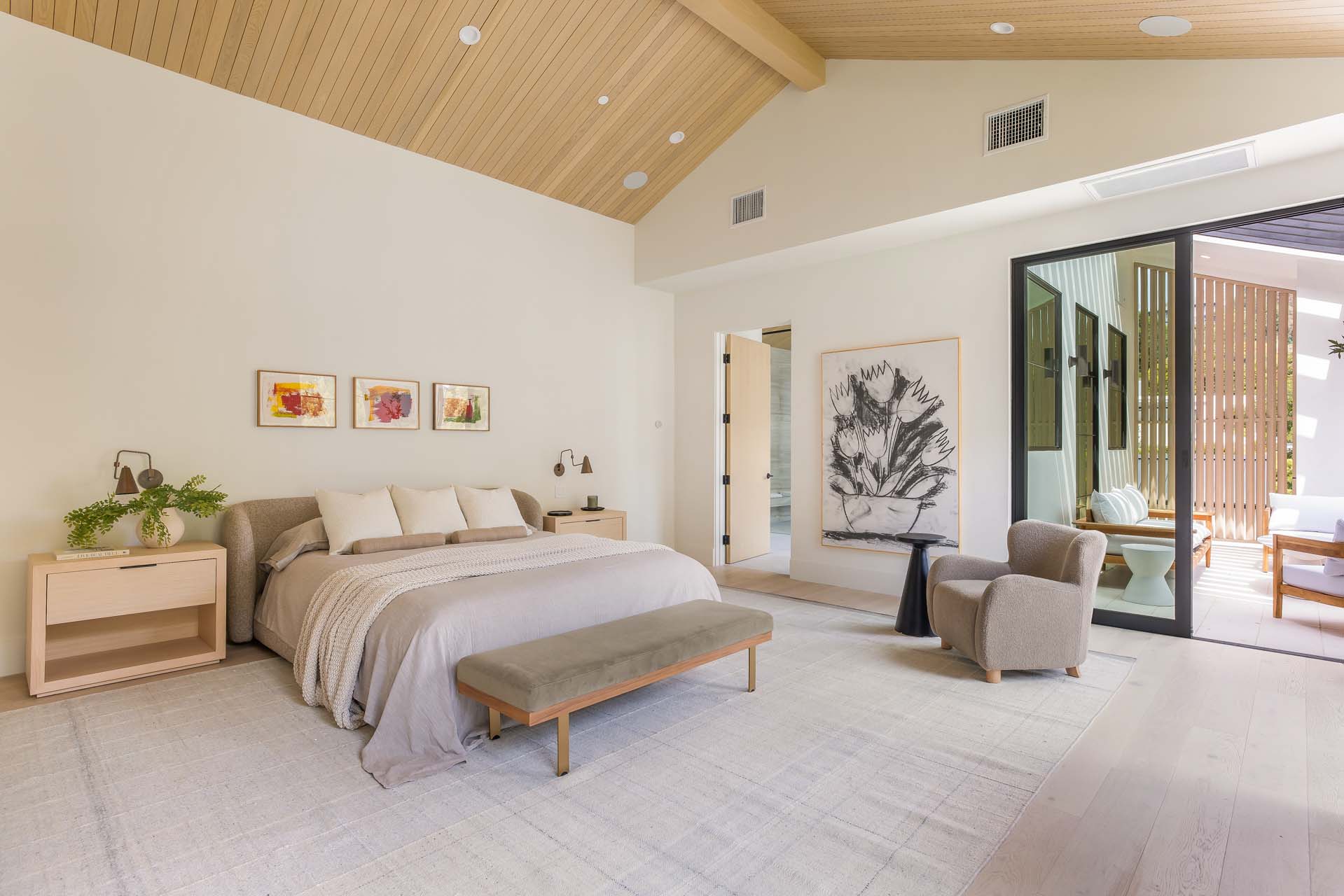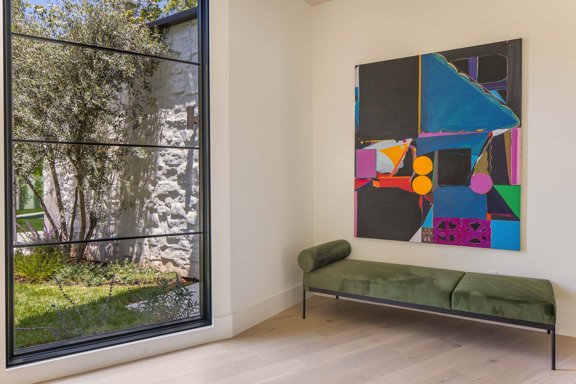 Nestled at the end of a quiet cul-de-sac on a tranquil lane just off the first block of lower Mandeville Canyon, this brand-new construction Modernist Farmhouse blends architectural sophistication with refined, organic design. Set on an expansive 18,000 square foot lot, this estate offers unparalleled privacy and sophistication in one of Brentwood’s most coveted neighborhoods. Crafted with meticulous attention to detail, the home’s handsome stone cladding and light wood accents seamlessly blend natural textures with contemporary design. A soaring two-story entry with exceptional volume welcomes you into a natural light-filled oasis, thoughtfully designed for both entertaining and everyday living. At the heart of the residence is an expansive great room with artisanal Roman clay ceiling, handsome Black Taj marble slab fireplace, and walls of pocketing Fleetwood glass doors leading to a resort-style backyard with elegant cabana and sparkling pool. Chef’s kitchen with Calacatta Aella marble finishes, state-of-the-art Sub-Zero and Wolf appliances, and an open-concept layout that ensures a seamless flow between the great room and formal dining room. Primary suite aerie with vaulted ceiling and elegant spa-inspired bathroom. Three additional bedroom suites up, each with luxurious baths showcasing Misterio marble finishes. Sophisticated downstairs powder room with artful, minimalist raked stucco walls and Lacava vessel sink. Spacious state-of-the-art screening room delivers a cinematic experience, while the Control4 smart home automation and built-in surround sound ensure effortless control of lighting, climate, security cameras, and entertainment. Expansive walls bathed in diffused natural light for a serious art collection. A singular, Brentwood estate blending glamorous indoor/outdoor living, comfort, and unparalleled amenities.