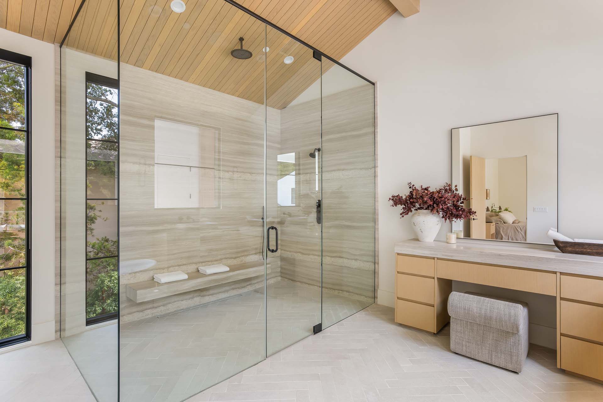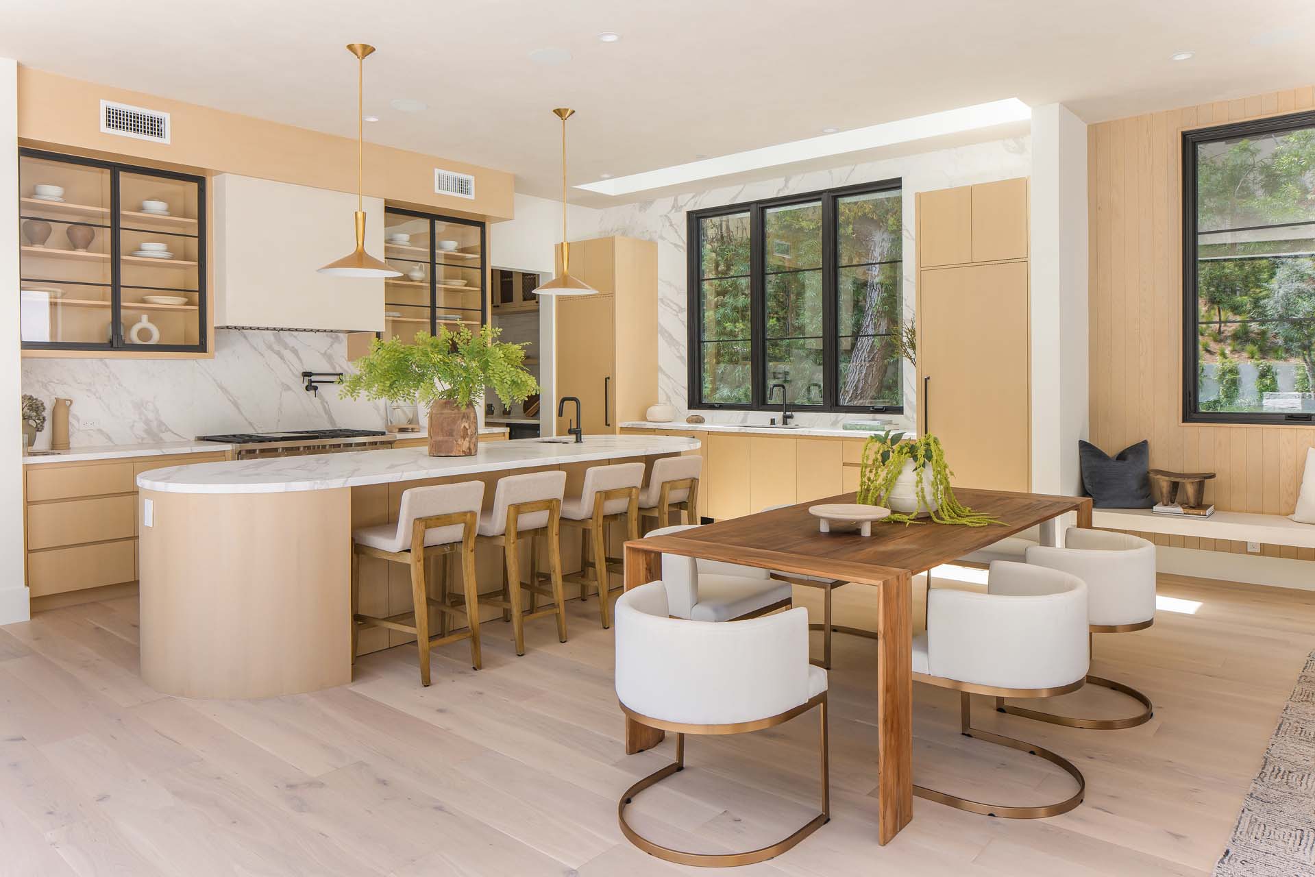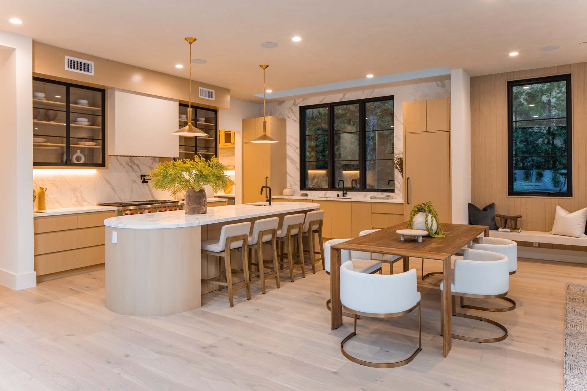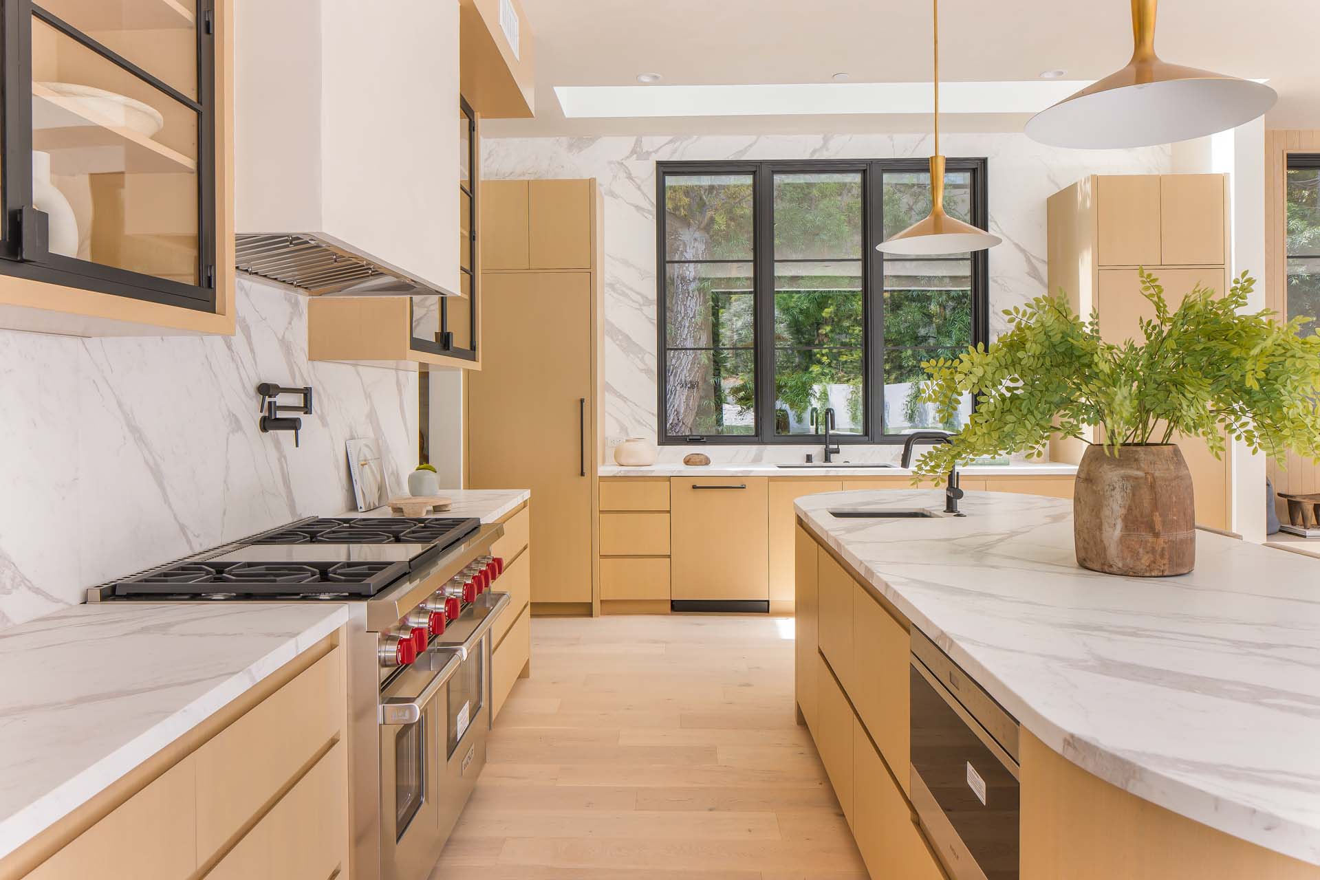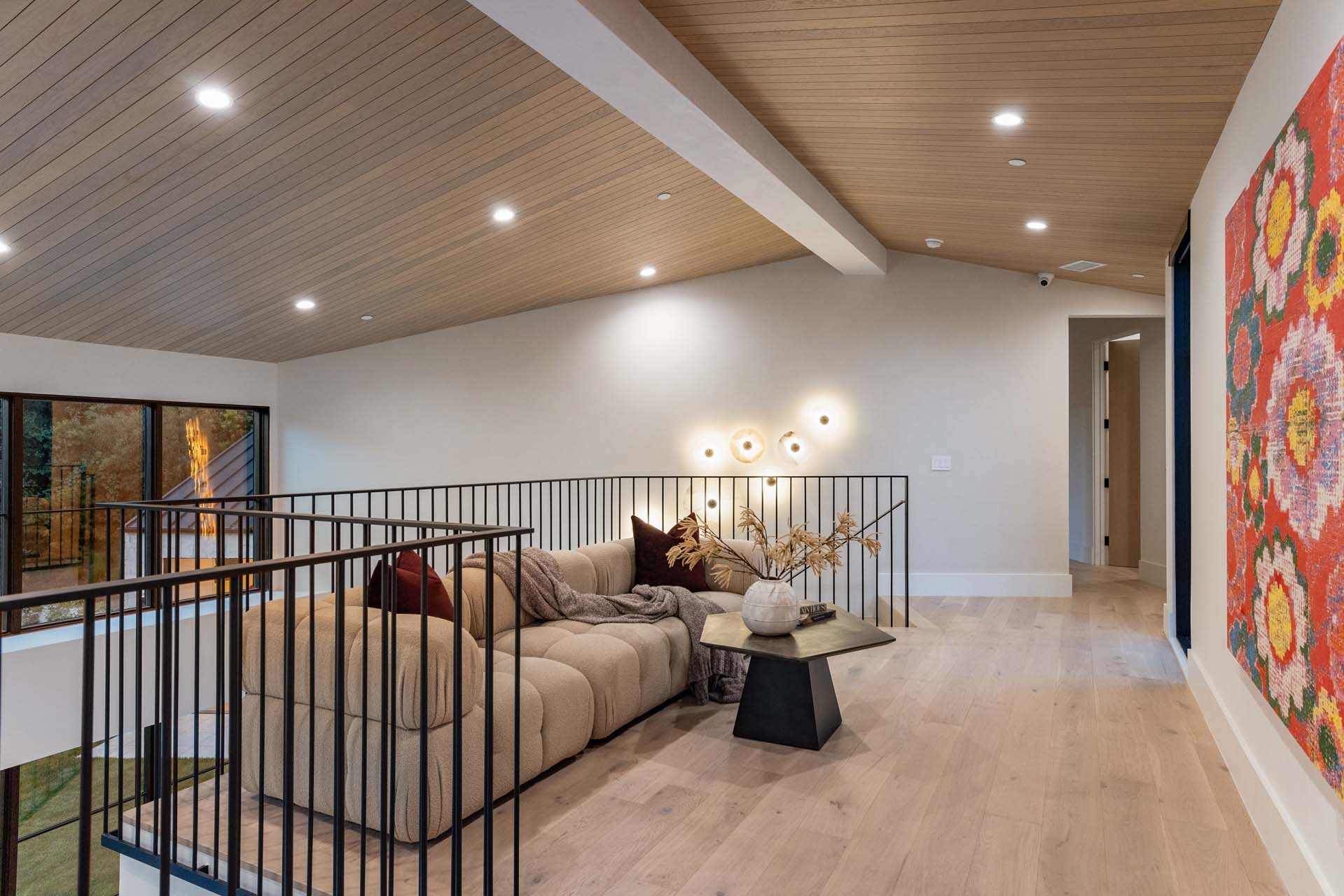 Nestled at the end of a quiet cul-de-sac on a tranquil lane just off the first block of lower Mandeville Canyon, this brand-new construction Modernist Farmhouse blends architectural sophistication with refined, organic design. Set on an expansive 18,000 square foot lot, this estate offers unparalleled privacy and sophistication in one of Brentwood’s most coveted neighborhoods. Crafted with meticulous attention to detail, the home’s handsome stone cladding and light wood accents seamlessly blend natural textures with contemporary design. A soaring two-story entry with exceptional volume welcomes you into a natural light-filled oasis, thoughtfully designed for both entertaining and everyday living. At the heart of the residence is an expansive great room with artisanal Roman clay ceiling, handsome Black Taj marble slab fireplace, and walls of pocketing Fleetwood glass doors leading to a resort-style backyard with elegant cabana and sparkling pool. Chef’s kitchen with Calacatta Aella marble finishes, state-of-the-art Sub-Zero and Wolf appliances, and an open-concept layout that ensures a seamless flow between the great room and formal dining room. Primary suite aerie with vaulted ceiling and elegant spa-inspired bathroom. Three additional bedroom suites up, each with luxurious baths showcasing Misterio marble finishes. Sophisticated downstairs powder room with artful, minimalist raked stucco walls and Lacava vessel sink. Spacious state-of-the-art screening room delivers a cinematic experience, while the Control4 smart home automation and built-in surround sound ensure effortless control of lighting, climate, security cameras, and entertainment. Expansive walls bathed in diffused natural light for a serious art collection. A singular, Brentwood estate blending glamorous indoor/outdoor living, comfort, and unparalleled amenities.